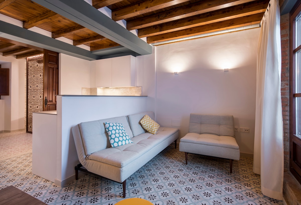 Art Chapiz är en solig, vacker och mysig lägenhet med 2 sovrum belägen i den emblematiska Albaicin, med utsikt över Alhambra skogen och Generalife Palace på 10 minuters promenad. Mitt i Albaicin, nära San Nicolas utsiktspunkt, mest ikoniska utsiktspunkten i Granada, och gränsar till Sacromonte-distriktet, bästa platsen för Flamenco Shows (Zambras). Riktig lyx mitt i allt. Parkering finns tillgänglig! Läs bara våra 200+ 5 STJÄRNIGA OMDÖMEN och se varför vi är SUPER-HOSTS!