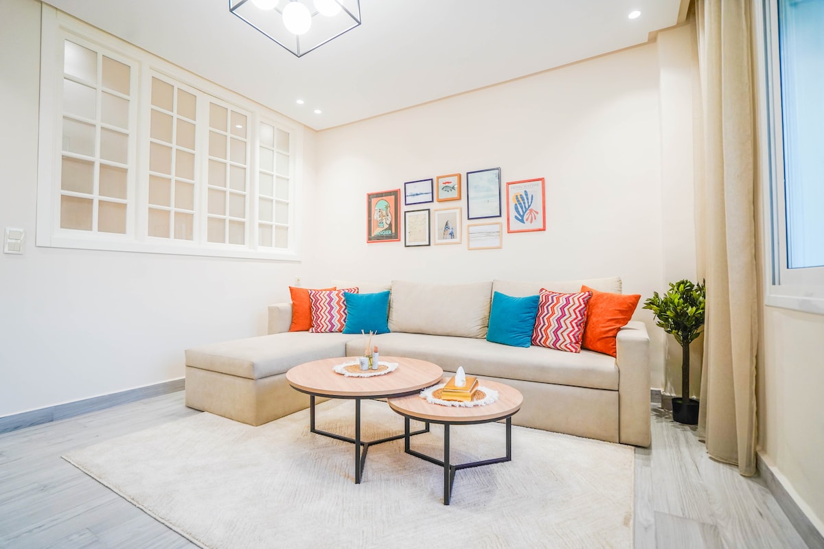 Lägenheten erbjuder vacker havsutsikt och har ett centralt läge, nära medinan, marinan och många kaféer, restauranger och butiker.Marjane ligger precis intill för extra bekvämlighet. Här finns två sovrum, två badrum, ett kök öppet till vardagsrummet, Wi-Fi, luftkonditionering och en parkeringsplats. Ett praktiskt och bekvämt boende i hjärtat av staden perfekt för en trevlig vistelse.