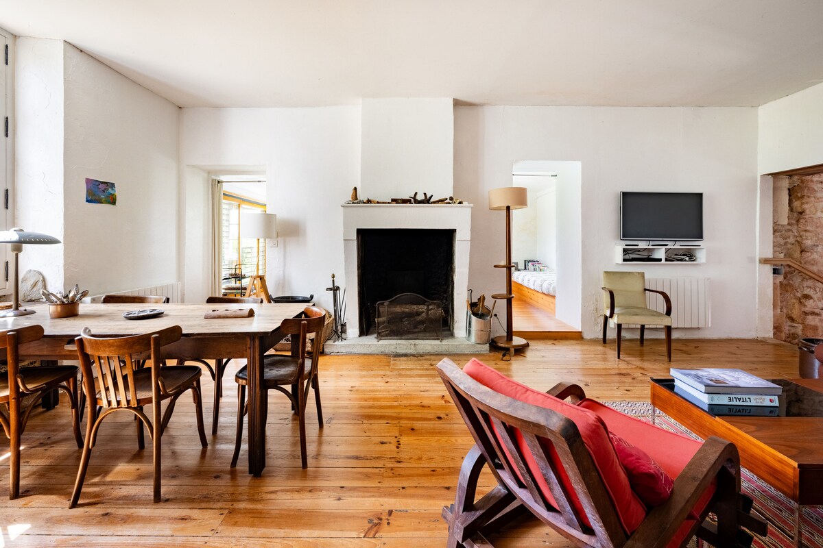 Vi erbjuder detta vackra renoverade hus i ett tidigare snickeri. Perfekt för att umgås med vänner, familj eller för företag (teambuilding, coworking openspace...), fotografering, filminspelning... Hitta dig själv på en unik och tidlös plats: -1 Avkopplingsområde, inomhuspool 7 m x 3 m och 1,40 m djup. Uppvärmd året runt (28/30 grader) - 1 riktigt 6-håls amerikanskt biljardbord - 1 riktigt Bonzini foosball-bord 220 m2