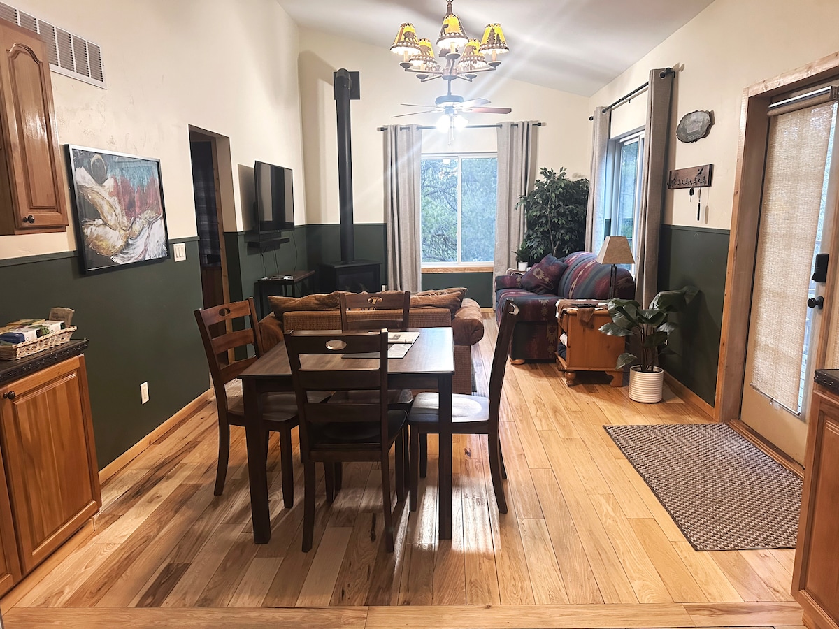 Come enjoy our private 5 acres of Pinon trees with the convenience of being 5 minutes from town. Enjoy the joys of children on property and views of incredible mountains with the wildlife that frequents our "back yard". Relax in our private guest area locked off from the rest of our home including a kitchenette and laundry area, all separated from the rest of the house by a custom built and locking doorway. We accept dogs but cannot accept cats due to other guests’ allergies. There is a pet fee.