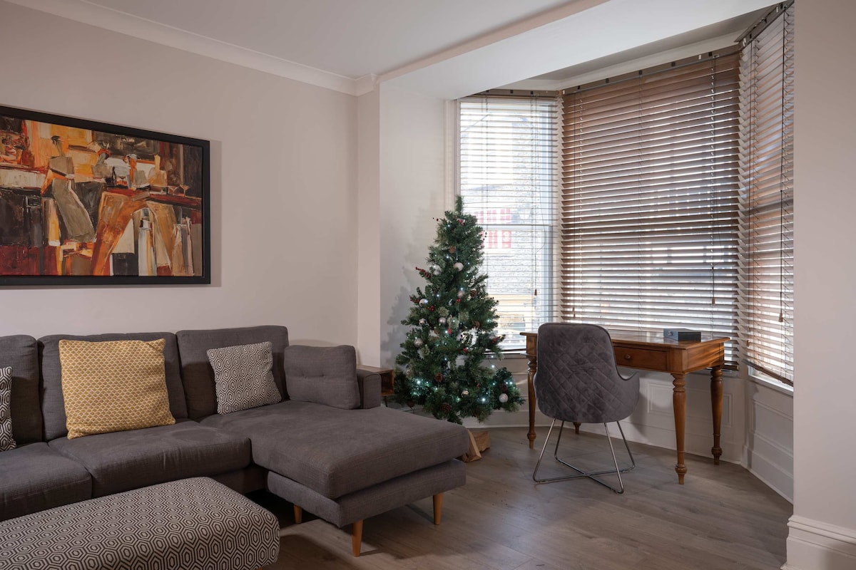 Discover "The Snug" in Kendal, a historic studio apartment with modern luxury. Dating back to 1750, it retains its original beams, now paired with a stunning kitchen, bathroom, and a cozy mezzanine called "The Snug." Enjoy serene views of the grounds and church, with parking just 20 yards away. Furnished with Zleepy bedding and Swyft furniture, it's the perfect romantic getaway. Experience history and comfort in one unique package at "The Snug."