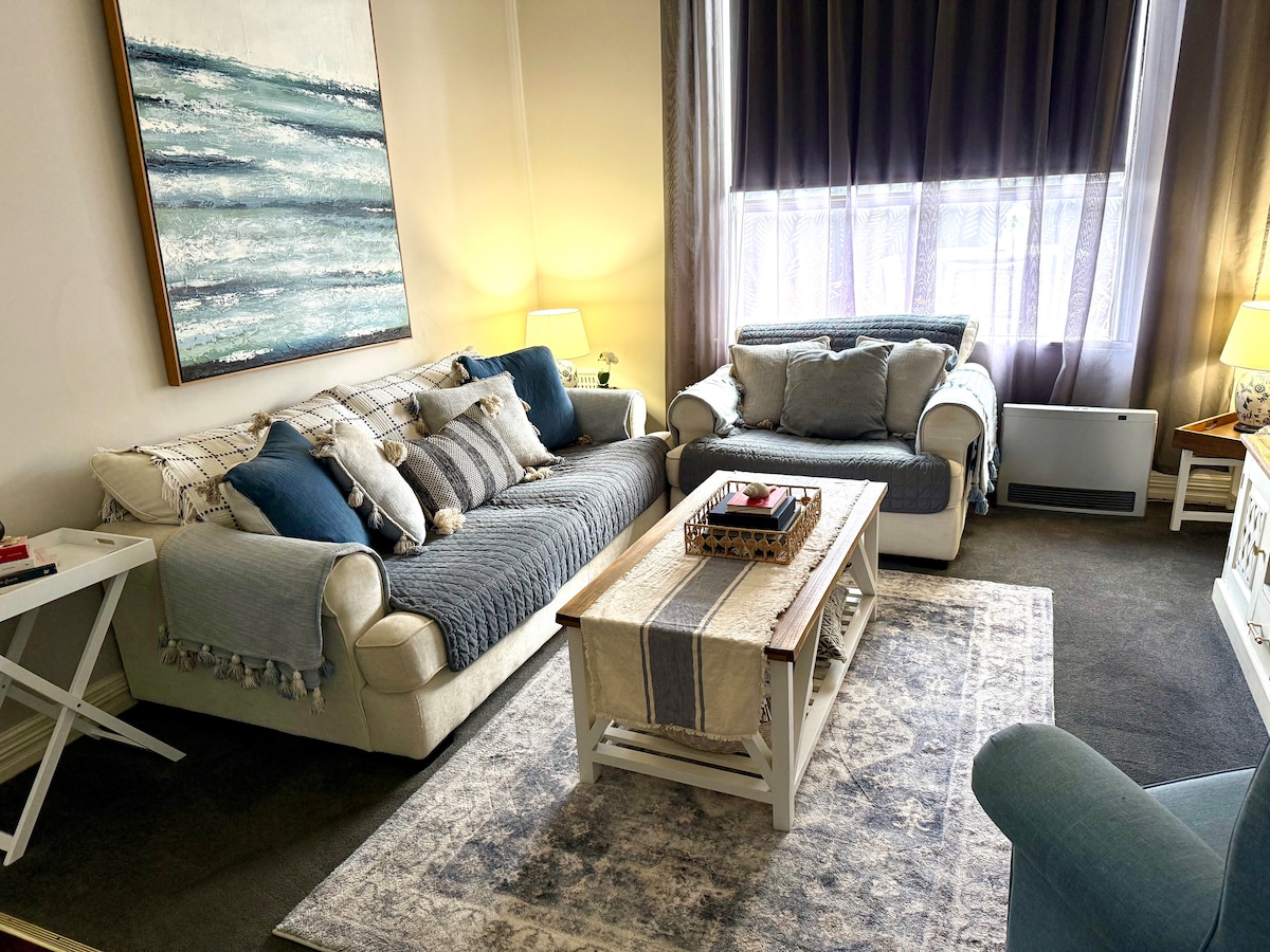 Udda bekväm stuga som rymmer sex i luftkonditionerad komfort. Gratis wifi, bred uppfart, utrustat pentrykök, två smarta TV-apparater, välkomstpaket. Alla sängkläder inklusive handdukar tillhandahålls. Observera: toaletten är utanför (bokstavligen två steg ut ur huset, under tak), sällsynta tågljud, trappsteg och en liten trappa i huset. Ingen tvättmaskin eller torktumlare. Annonsera inte på sociala medier för att en lokal barnvakt ska kunna bo i huset, airbnb kommer att avboka din bokning.