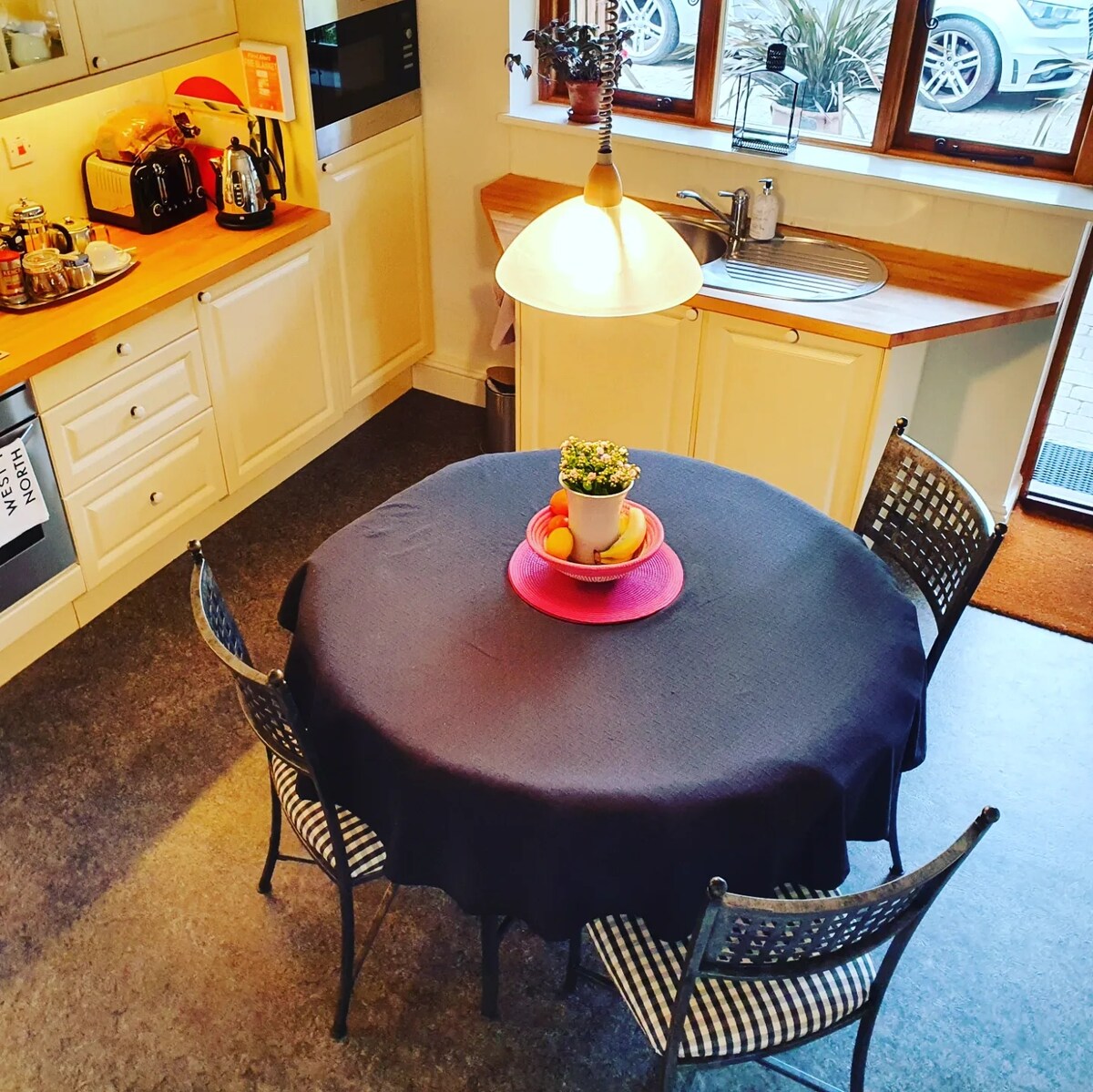 Vår fristående, bottenvåning studio lägenhet för två gäster, är en av endast två enheter på plats. Det är en reträtt, en praktisk arbetsyta eller en bekväm bas för att utforska. I kokvrån finns kylskåp, mikrovågsugn, kokplatta, brödrost och miniugn för matlagning. Fullt utrustat duschrum, elektrisk dusch. Huvudområdet har en king-size säng, soffor, ett bord och stolar, en vedeldad brännare. Den har egen ingång via en gemensam korridor med lägenheten på övervåningen.