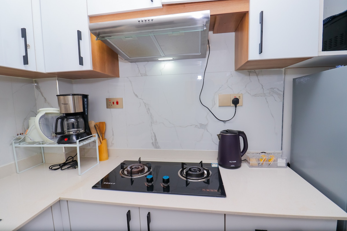 Glöm alla vardagliga bekymmer i detta rymliga och fridfulla boende i hjärtat av Westlands, Nairobi. Boendet är perfekt både som kort- och långtidsuthyrning. Det har fullt utrustat kök, en 50 tums platt-TV, WIFI, Netflix, kaffebryggare, laptopvänligt arbetsutrymme, balkong och låsbar kassaskåp. Gemensamma bekvämligheter inkluderar, restaurang, salong, frisör, pool och reservgenerator.
