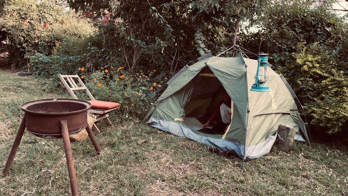 TVÅ VATTENTÄTA CAMPINGTÄLT som rymmer 2 personer vardera. Väl utrustad med bekväma madrasser, bärbara lampor, utomhusbadrum med varm dusch och en tre-sten matlagningsupplevelse. Priset inkluderar ● Frukost, SJÄLVHUSHÅLL tillbehör (mjölk, ägg, frukt, bakade bönor, paketjuice och bröd) ● Wifi men inte så stabilt Grundläggande spel på● plats (bågskytte, Jenga, Tic-tac, badminton och damspel) ●Bonfire, halv kolgrill ●Tvål, handdukar, tofflor, näsdukar och dricksvatten ●Gazebo-området och personalen på plats