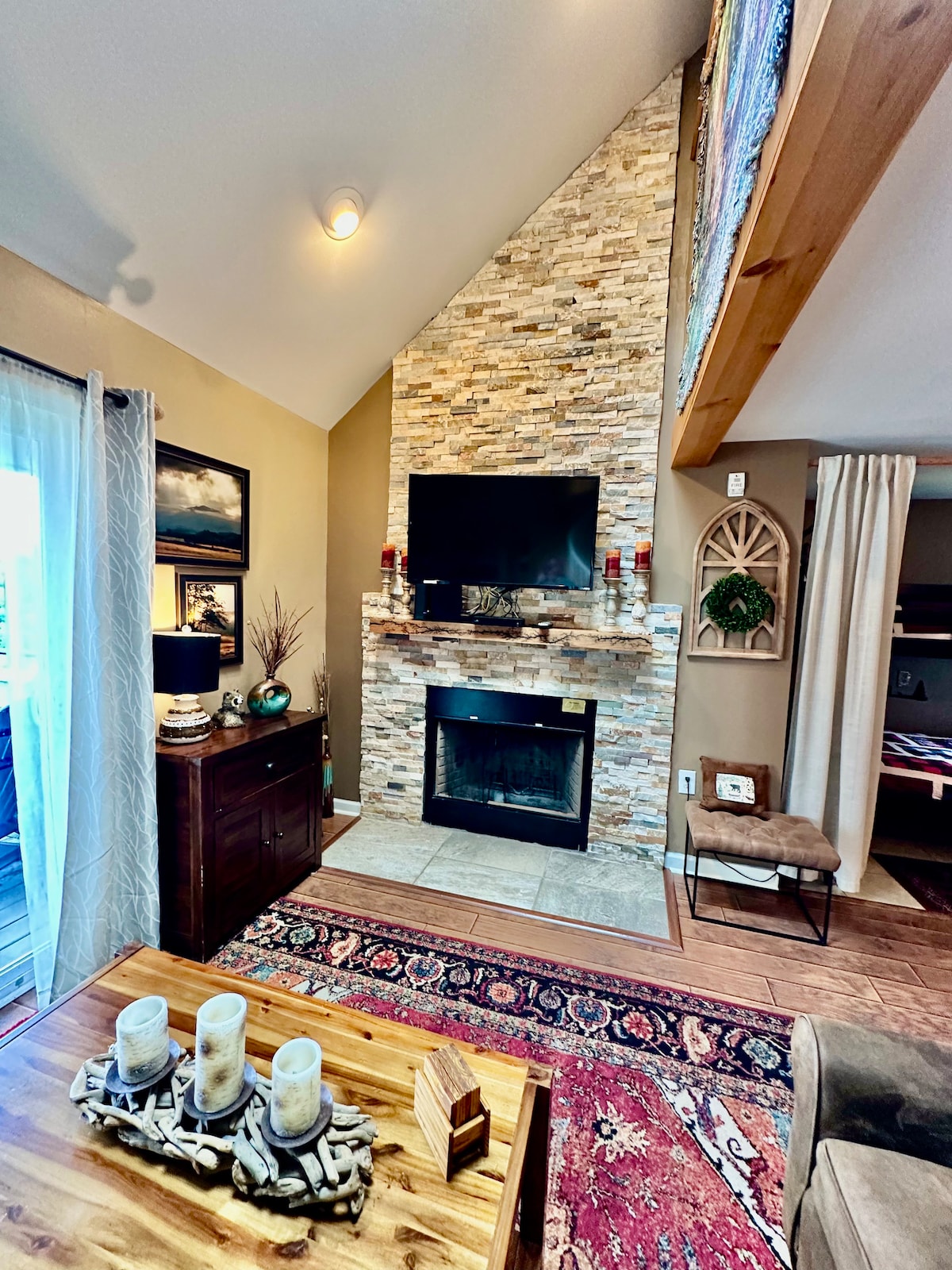 Beläget på 3 000 fot Gatlinburg Summit Complex har oöverträffad rökig bergsutsikt. Vår nyrenoverade Studio Loft-enhet inkluderar en privat balkong och takfönster i loftområdet med fridfull utsikt över dalen. Enheten inkluderar 2 queen-sängar, en ny elektrisk öppen spis, nya möbler, bänkskivor i granit, moderna apparater, SNABBT privat Wi-Fi, HD-kabel och Smart TV. Utomhus- och inomhuspool, två bubbelpooler, klubbhus, lekplats och picknick/grillplats.