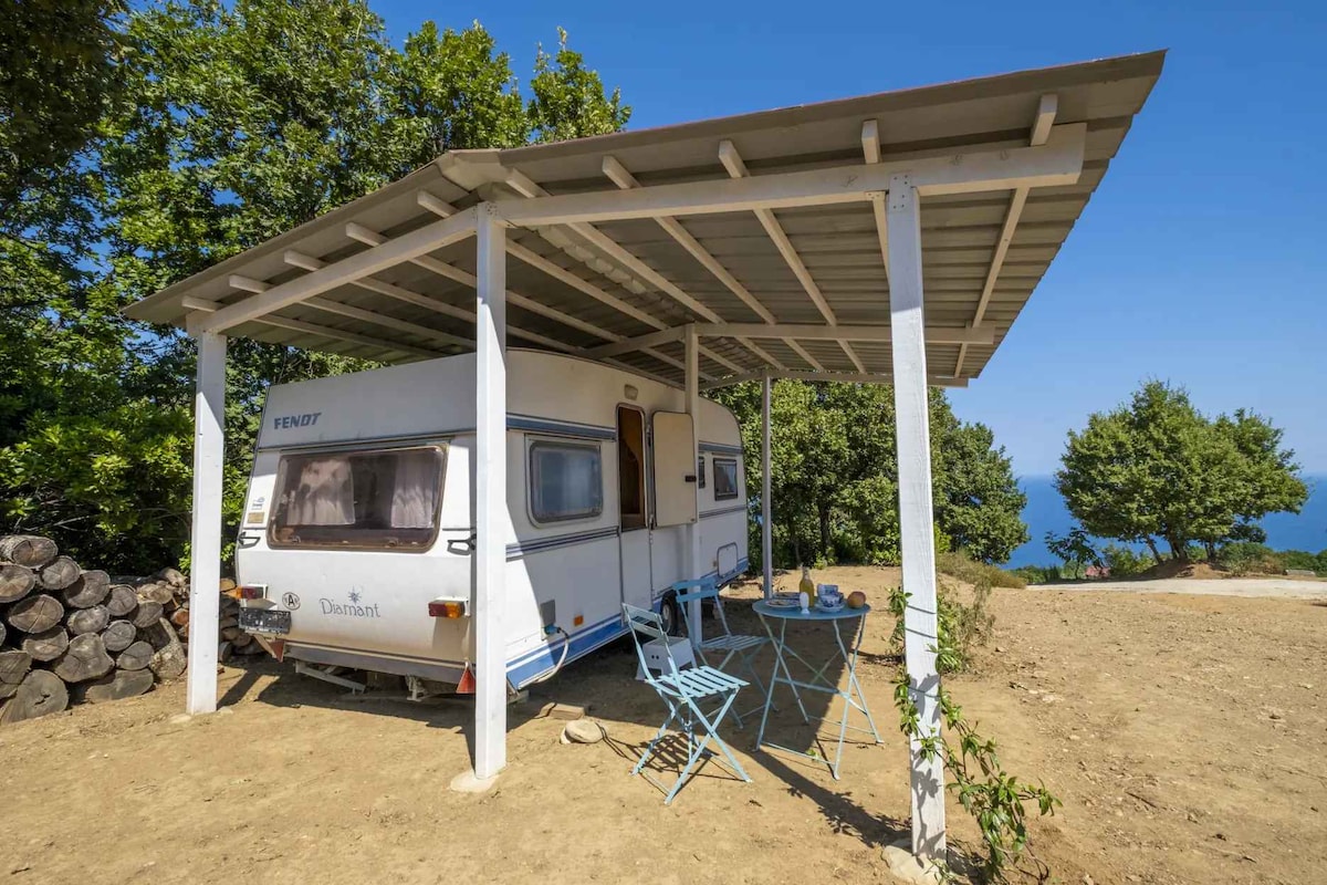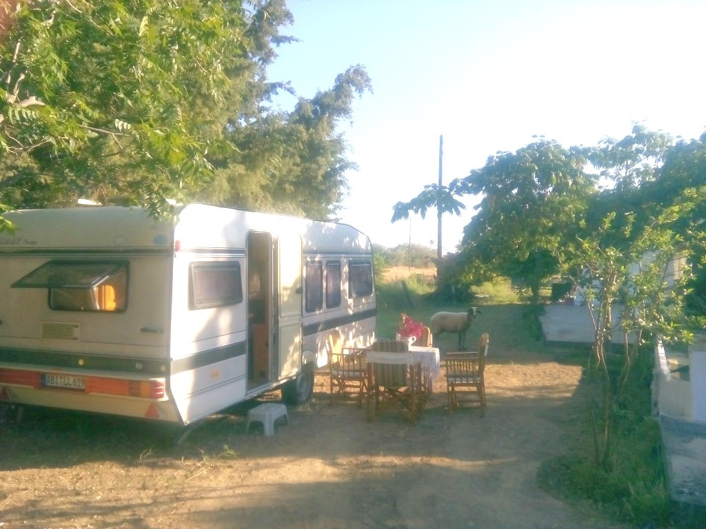 Husvagnen ligger på lugn och inhägnad mark och ger avskildhet och panoramautsikt över havet och de omgivande kullarna. Lämpligt för par eller familjer med upp till två små barn. Husdjur är välkomna. En gångväg leder ner till stranden Megas Gyalos på ett avstånd av 10 minuters promenad. På grund av att det inte finns någon tillgång med bil eller motorcykel är stranden alltid ganska med mycket få eller inga människor alls. Under natten är utsikten över stjärnorna och konstellationerna magiska.