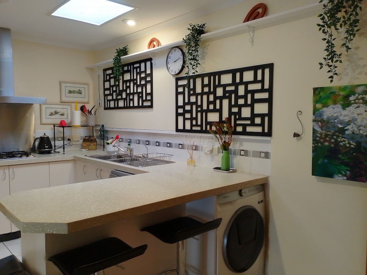 Recently built light filled unit with Smart TV with Netflix and well equipped kitchen including DishDrawer dishwasher. All hours check in with key safe. Street facing front entrance and sliding doors at the rear which open onto a timber deck for your personal use. Short walk to Southlands Shopping Centre which includes great restaurants and Asian and Middle Eastern specialty food shops.