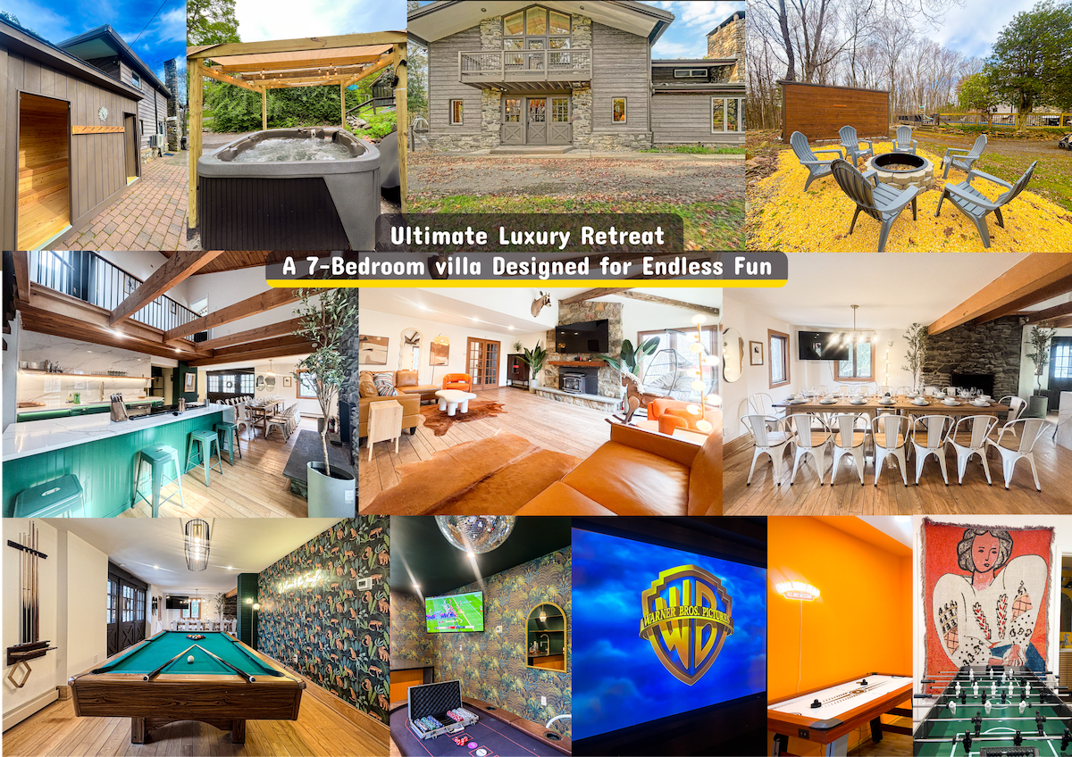 Vårt enorma 5000 kvm, 7 sovrum, 4,5 badrum hem som rymmer 20 gäster, ligger mycket centralt i hjärtat av Poconos. Njut av den fantastiska platta bakgården med helt ny UTOMHUS PRIVAT INGROUND POOL (20x40 storlek, 3’-6’ djup) Smakfullt inrett, detta boende har allt du behöver för att njuta av din tid oavsett om du vill koppla av, spela ett spel poker, biljard eller laga en familjemåltid i vårt överdimensionerade kök för en stor grupp! [INGROUND POOL STÄNGD FÖR SÄSONGEN]