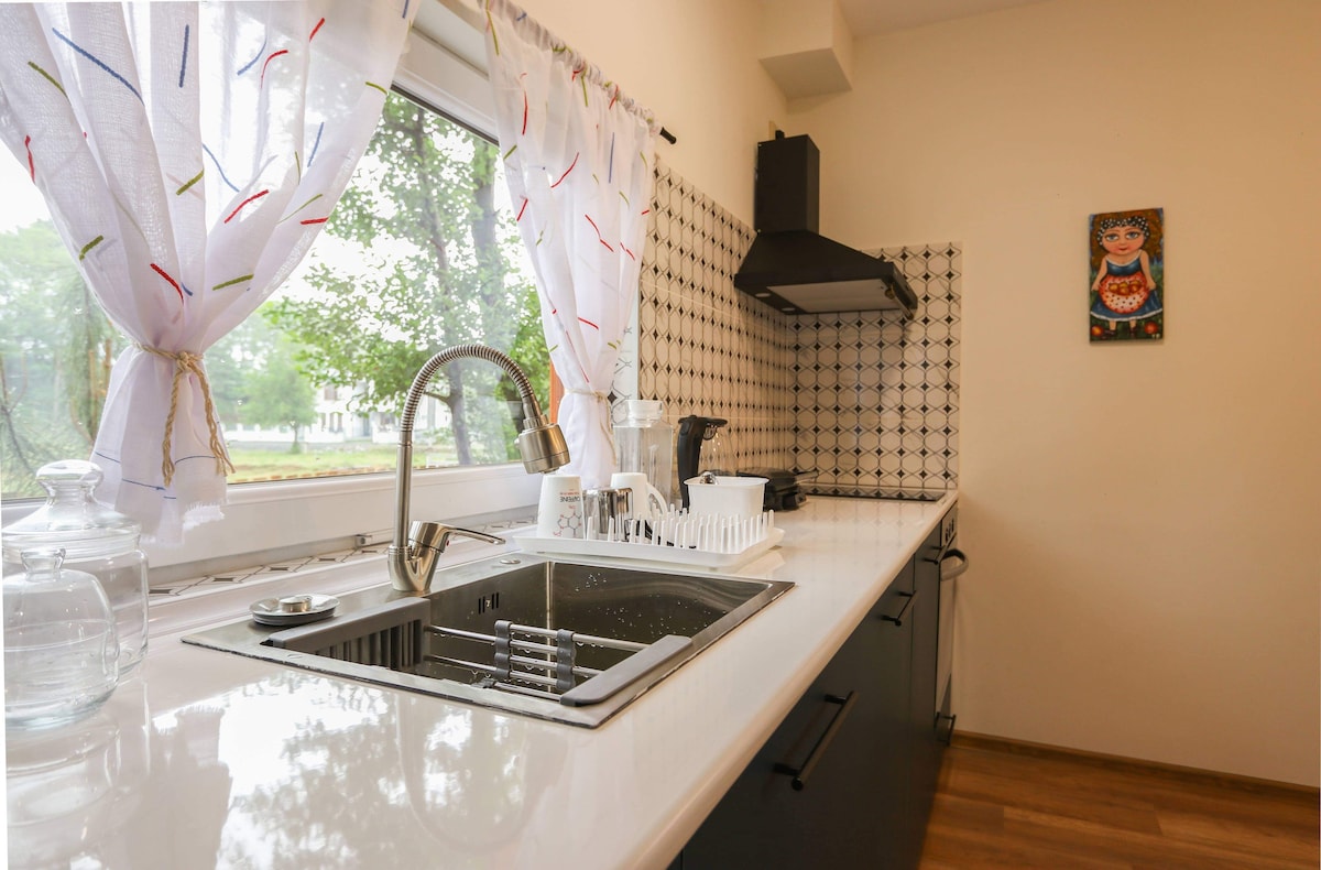 Helt semesterhus att hyra. Boendet har allt du behöver för att stanna så länge du behöver det. All utrustning och sängar (madrasser och sängkläder) är nya. Det finns internet, satellit-TV (olika länders kanaler). I närheten finns en vacker trädgård och utomhusrum. Gratis privat parkering finns tillgänglig inom fastigheten. Stranden kan nås med taxi (5 lari) eller med buss N 7 och 15 (0,5 lari, 20 minuters resa).
