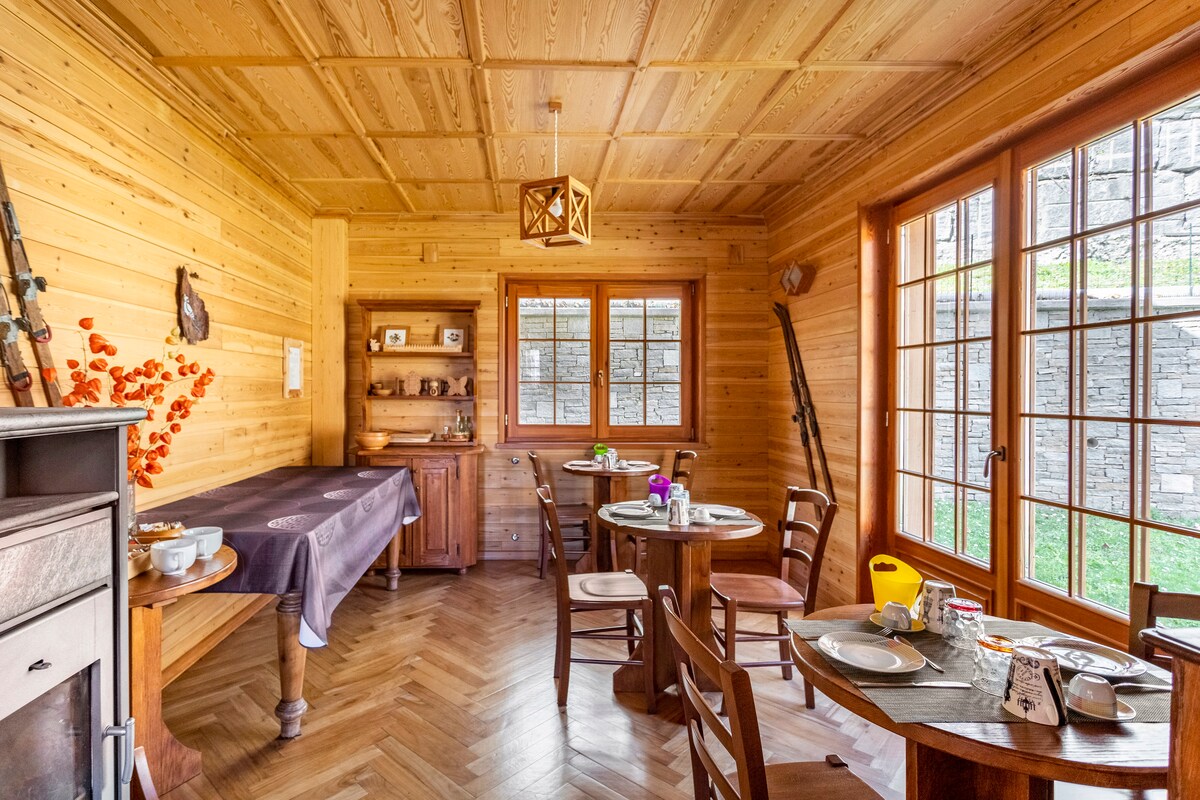 Privat boende för två personer i ett vackert trähus med fantastisk utsikt över en gård omgiven av grönska. Erbjudande för två personer inklusive frukost. En middag med levande ljus kan bokas för 160 fr. (vänligen beställ i förväg). Betalning på plats med Twint eller kontant. Köket kan användas mot en städavgift på 25 fr.