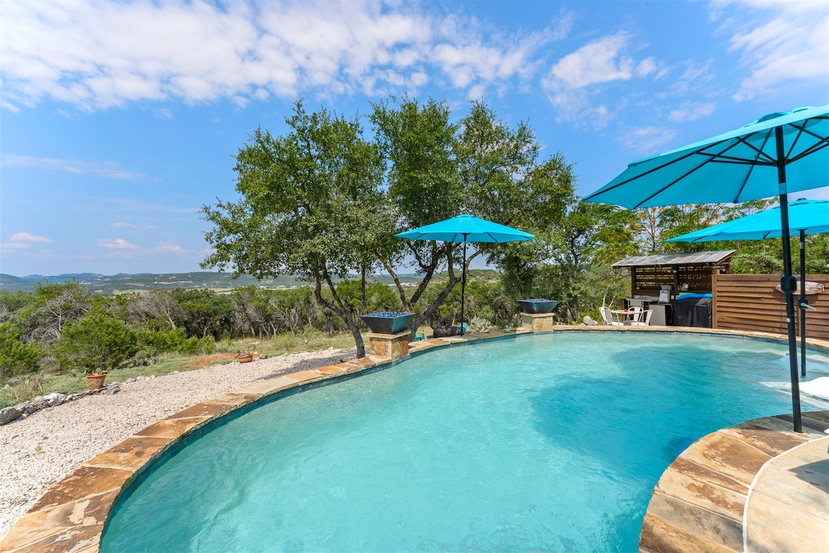 Njut av skogsutsikten från den bakre verandan dagbädd och fönsterbar. Huset ligger på trädbelägen mark, nära Alligator creek, med utsikt över kullarna och naturlig charm. Även om Texas äldsta danssal ligger bara fem minuters bilresa och en höger sväng bort, känns området fridfullt och avskilt. Gruene Hall: 2 mi Chandelier of Gruene: 2 miles Austin flygplats: 39 mi S. A. flygplats: 28 mi Schlitterbahn: 4 miles