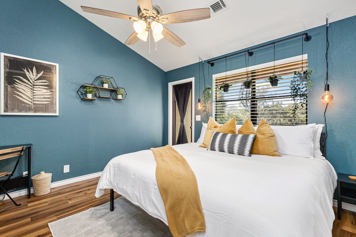 Fly till denna charmiga, djurvänliga tillflyktsort i ett lugnt grannskap i södra Austin! 🏡 Koppla av i Cowboy Pool, slappna av på däck med omgivande belysning eller tänd grillen för en perfekt kväll. Inomhus kan du njuta av lyxiga kingsize-sängar, höghastighets-WiFi (över 300 Mbit/s), ett fullt utrustat kök och en arbetsplats för distansarbete. Bara några minuter från parker, shopping och populära Austin-sevärdheter – perfekt för familjer, distansarbetare och resenärer. 🌿✨
