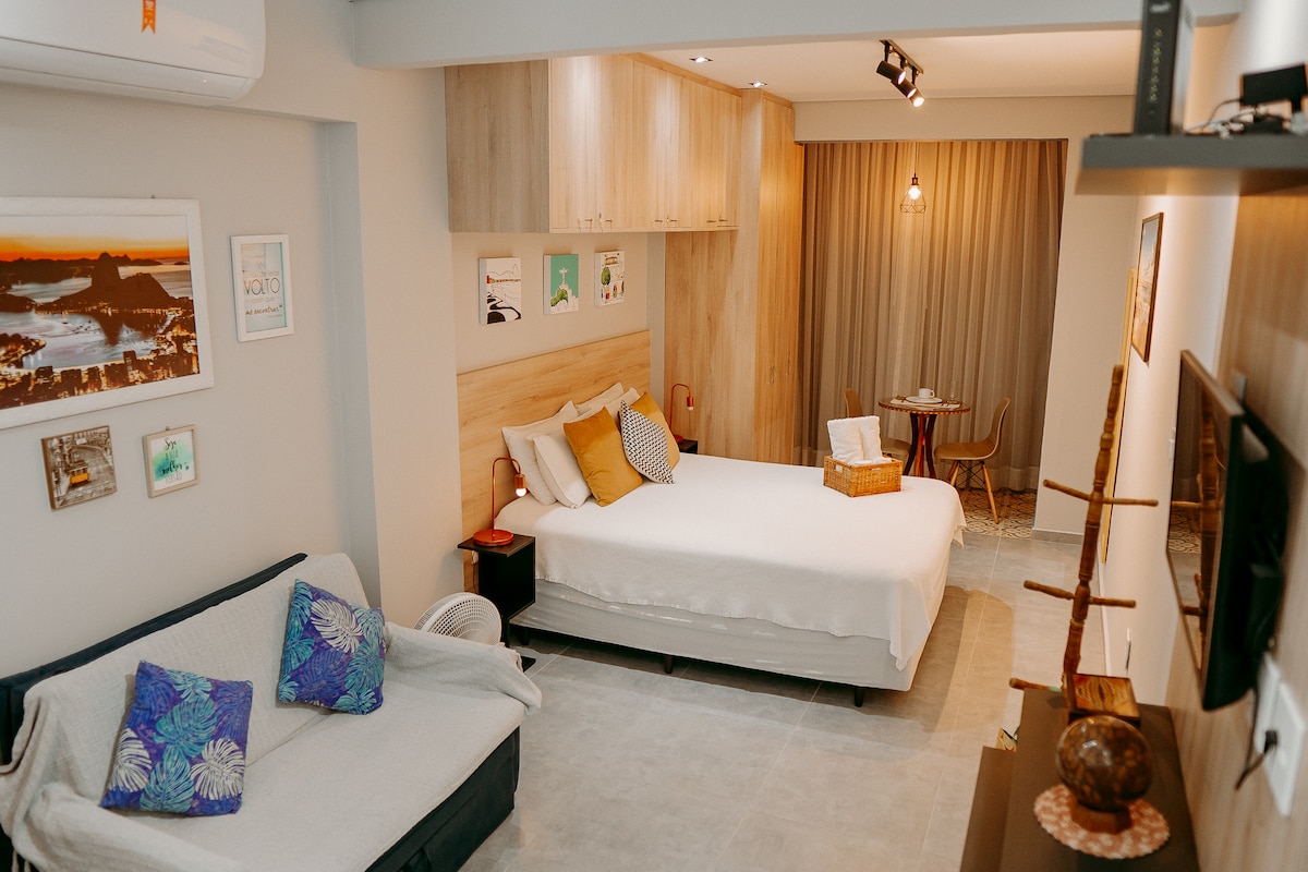 Loftet på 45 m2, bestående av ett vardagsrum och ett sovrum, designades av mig för att erbjuda gästerna maximal komfort och välbefinnande under vistelsen. Beläget på en hög våning med utsikt över Morro dos Irmãos och även sidovy över Ipanema-stranden från badrummet. Höghastighets-WIFI. TV med smartfunktion, luftkonditionering i båda rummen, tvättmaskin och utrustat kök. I sovrummet har vi en queen-size-säng och i vardagsrummet en bäddsoffa för två personer.