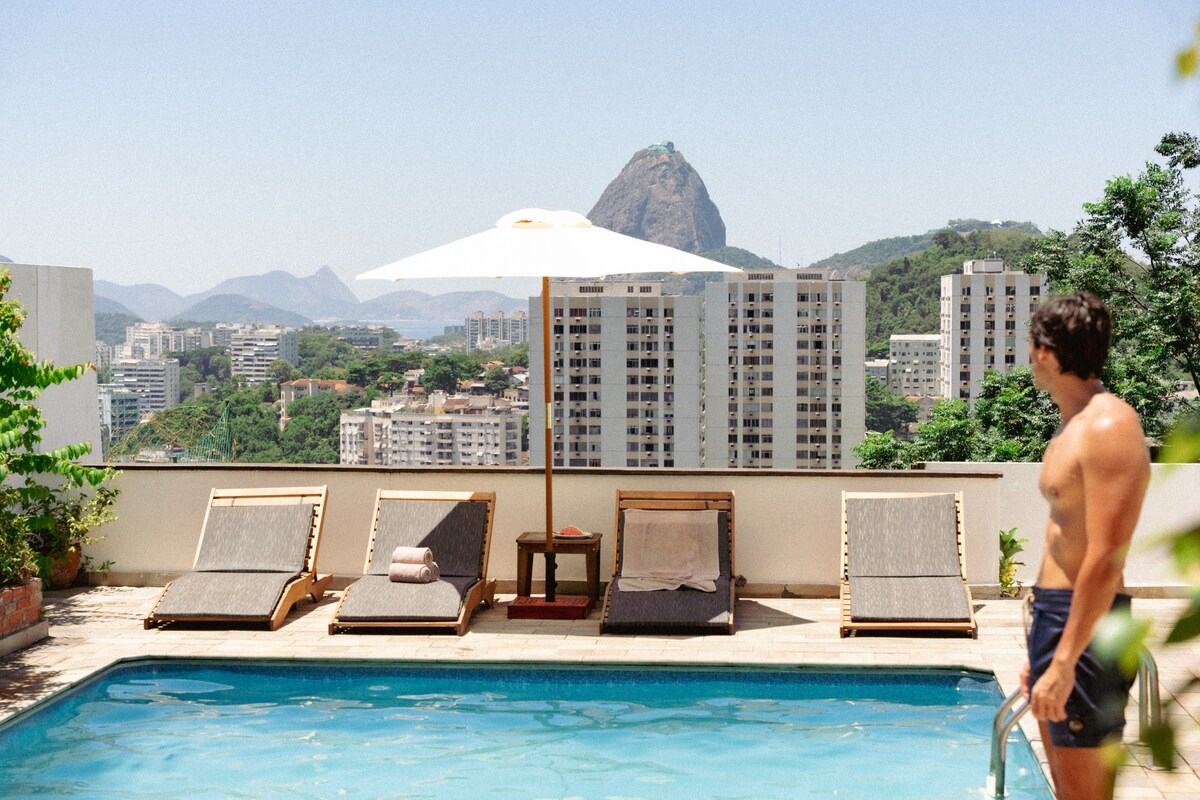Koppla av i detta lugna och eleganta boende med fantastisk utsikt över Sugarloaf och Rio Bay. Inbäddat på kullen Santa Teresa och strax ovanför Laranjeiras grannskap, kommer vårt hus att låta dig vila helt, med familj eller vänner, mitt i ett Carioca vykort. Om vissa vill arbeta är ett boende dedikerat till dem. Men här också, utsikten är fantastisk. En vaktmästare och en hushållsarbetare arbetar dagligen i huset.