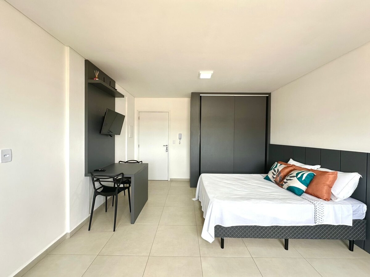 Ny, komplett, praktisk och mysig studio, några meter från Campo Real och Unicentro. Incheckning efter 15:00 och utcheckning senast 12:00. Här finns ett utrustat kök, snabbt wifi, smart TV, queensize-säng med premiumsängkläder, komplett badrum. Region med ett stort utbud av tjänster, mat och fritidsalternativ i närheten. Det har en pool och fitnesscenter. Det ligger på 7:e våningen, en byggnad med 2 hissar och en delad tvättstuga. Gör dig bekväm och känn dig som hemma. Sera är ett nöje att vara värd för dig.