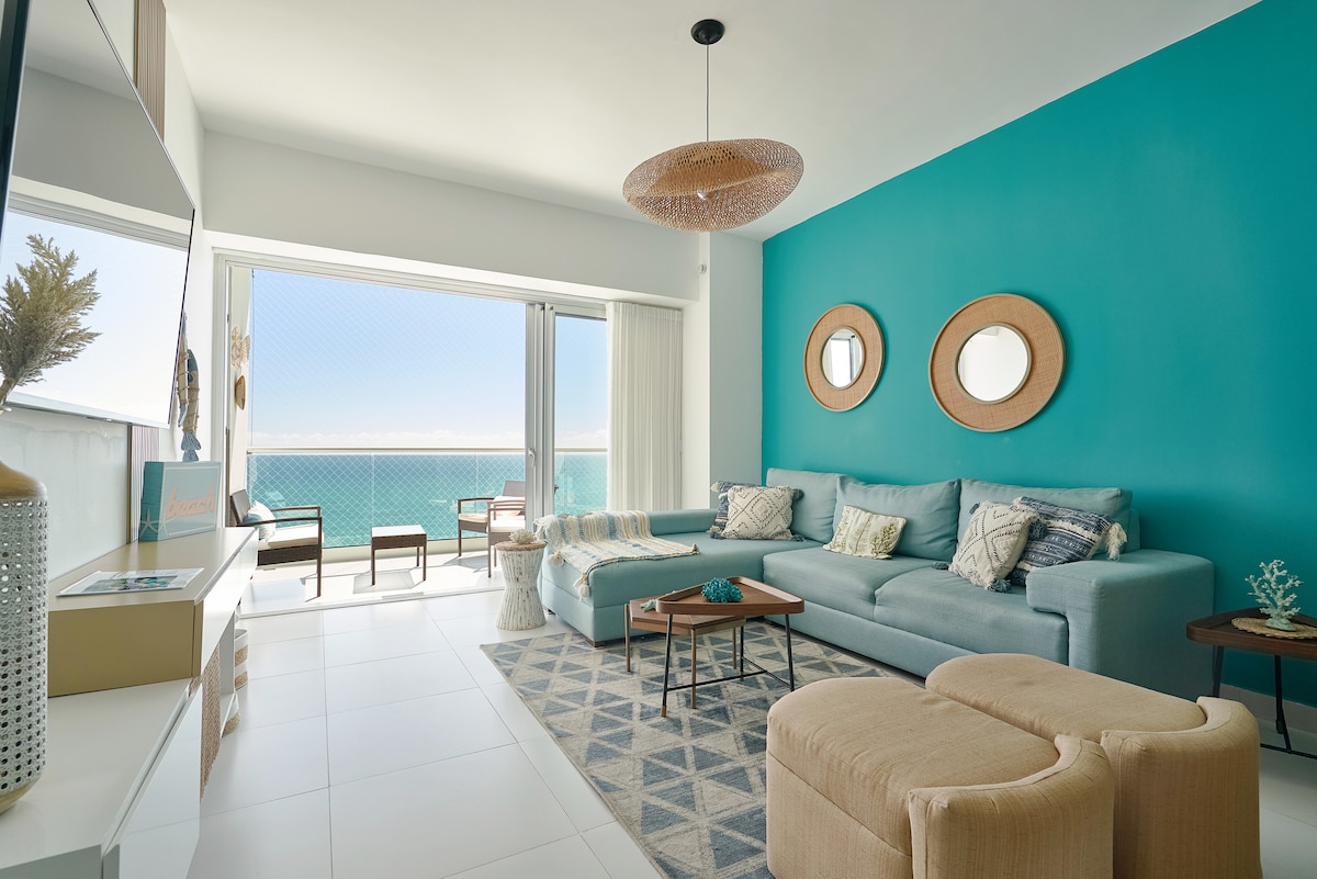 Enrumslägenhet mot Karibiska havet. Beläget på 17: e våningen i den lyxiga "Torre Aquarella"varifrån du kan uppskatta spektakulära solnedgångar. Rymmer 4. Den har luftkonditionering i hela lägenheten. Rymligt badrum, välutrustat kök bredvid matrum, vardagsrum och balkong. Rum med en Queen-säng. Ställ även bäddsoffor. Privat och bevakad parkering, Wi-Fi, TV. Luftkonditionering betalas separat. Kostnaden betalas i Kw per timme