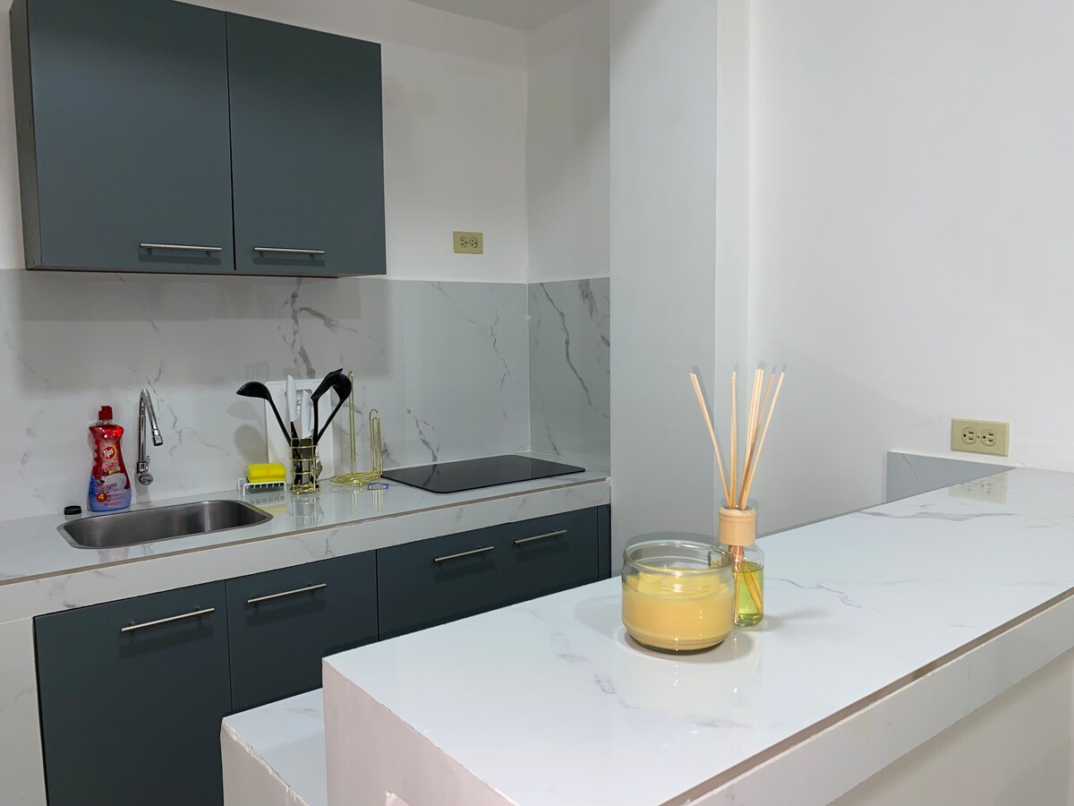 Svit med en välutrustad miljö för att göra din vistelse trevlig. Nytt, modernt och praktiskt utrymme. Nära C.C. Riocentro Norte, Mall del Río och CityMall Beläget på huvudgatan med direkt tillgång till kollektivtrafik eller om du har ett fordon kan du parkera vid foten av fastigheten. Perfekt för chefer, utlänningar eller par. Nära bagerier, butiker och restauranger. WIFI, NETFLIX, LUFTKONDITIONERING, VARMVATTEN.