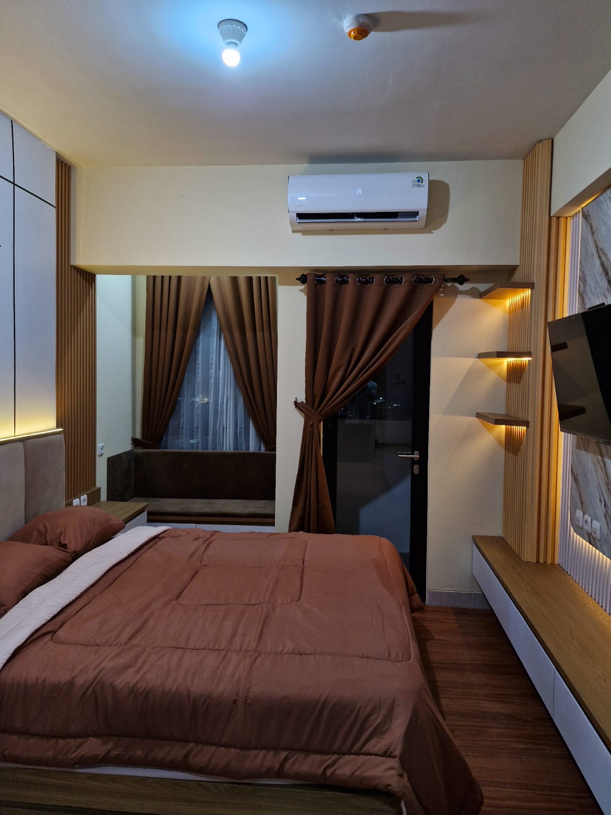 En mysig 1-rumslägenhet, med 2 sängar, i hjärtat av staden, nära Diponegoro University, och flera universitet i närheten. Har bra naturlig belysning från stora fönster och balkong. Komplett med ett eget kök och många skåp för förvaring. Helt ny smart-TV för Netflix, YouTube och Disney plus. fastigheten har en fantastisk oändlig 2 pool och gym på 5:e våningen. med fantastisk utsikt.
