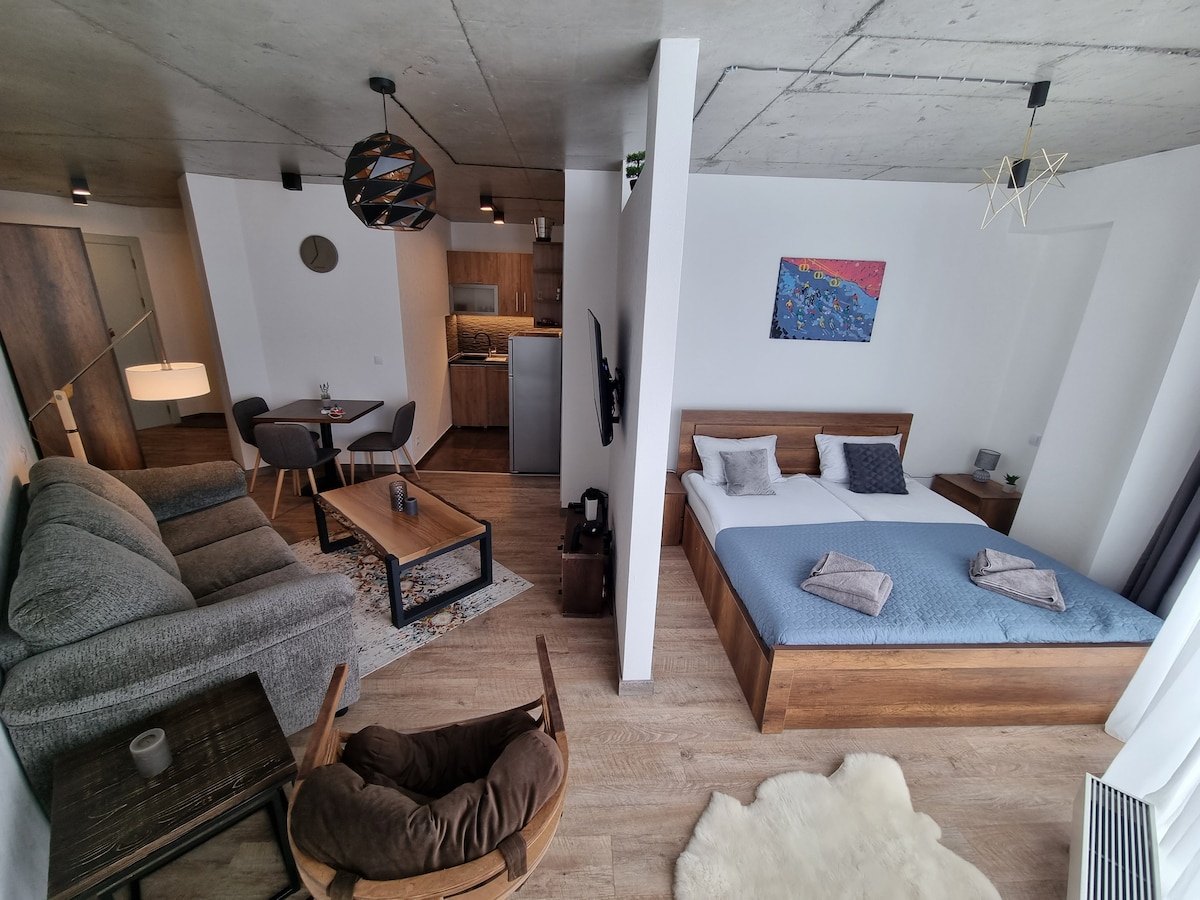 - Lägenheten ligger på Gudauri några steg från skidområdet. - Lägenheten är mysig plats, från balkongen kommer du att se en vacker utsikt över bergen. -Lägenheten är perfekt för små grupper av vänner, familjer och par som älskar skidor, berg och vacker natur! Denna moderna studio har ett pentry med alla bekvämligheter , en platt-TV och eget badrum med dusch. - Lägenheten har egen skiddepot - Lägenhet har en dubbelsäng och en bäddsoffa. - Självständig incheckning ( låst nyckelskåp)