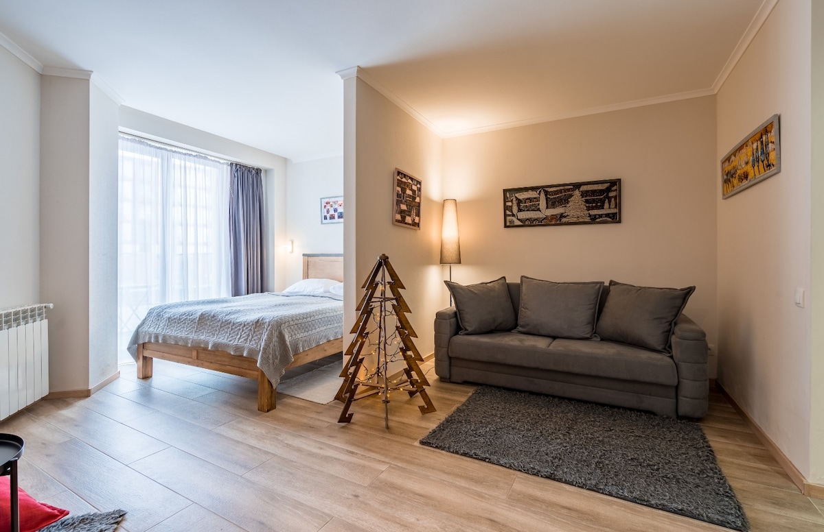 Welcome to the studio in Gudauri, Georgia, at an altitude of 2200 metres! Fresh renovation with wood and stone creates a cosy mountain atmosphere. Perfect lighting, functional areas - living room, bedroom, kitchen with panoramic windows giving natural light. The sunny side offers stunning mountain views. Close to the ski lift, shops and restaurants - ideal for a ski holiday. This studio combines style, comfort and functionality for an unforgettable holiday.