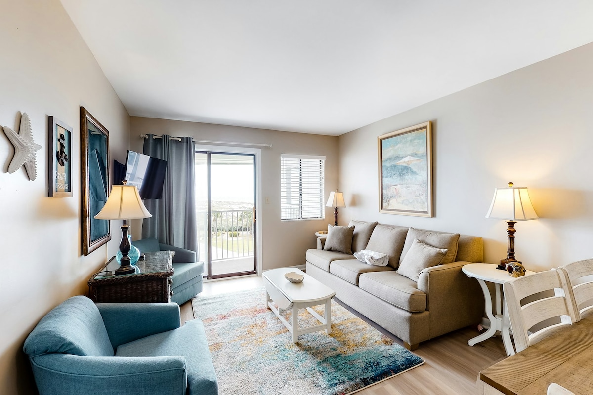 Njut av din vistelse på stranden hos oss! Vår lägenhet erbjuder en queen size säng i primära, smala våningssängar i hallen perfekt för små barn, och en queen bäddsoffa i vardagsrummet. Ditt morgonkaffe smakar bättre på balkongen med utsikt över stranden. Köket har diskmaskin, spis, vanlig 12 koppars kaffekanna, några kastruller och stekpannor, samt mikrovågsugn. Semesterorten har många bekvämligheter, inklusive två utomhuspooler, en inomhuspool och bubbelpool, plus ett fitnessrum och basket- och tennisbanor.