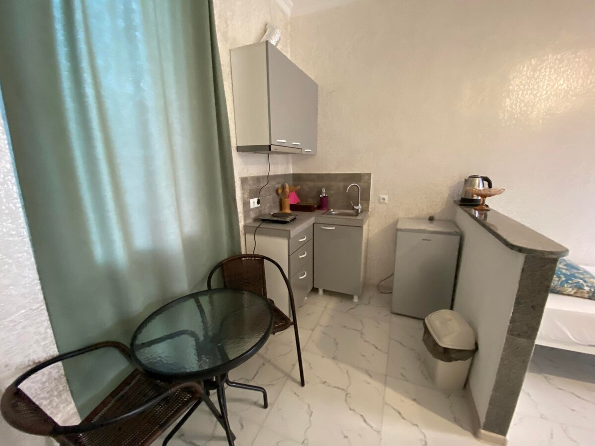 Nytt lägenhetshotell (byggt 2020) i ett lugnt område med privata hus i Kobuleti. Beläget 150 meter från kusten. En bred strand med små stenar,bekvämt för din semester. Mellan vårt hotell och stranden finns en kafé-terrass med hemlagad georgiansk och europeisk mat (på din begäran), priserna är överkomliga. Hotellet har eget rum med tvättmaskin och sängkläder torktumlare. Värdinnan Sopho kommer att möta dig på hotellet,som hjälper dig att lösa eventuella problem under din vistelse.