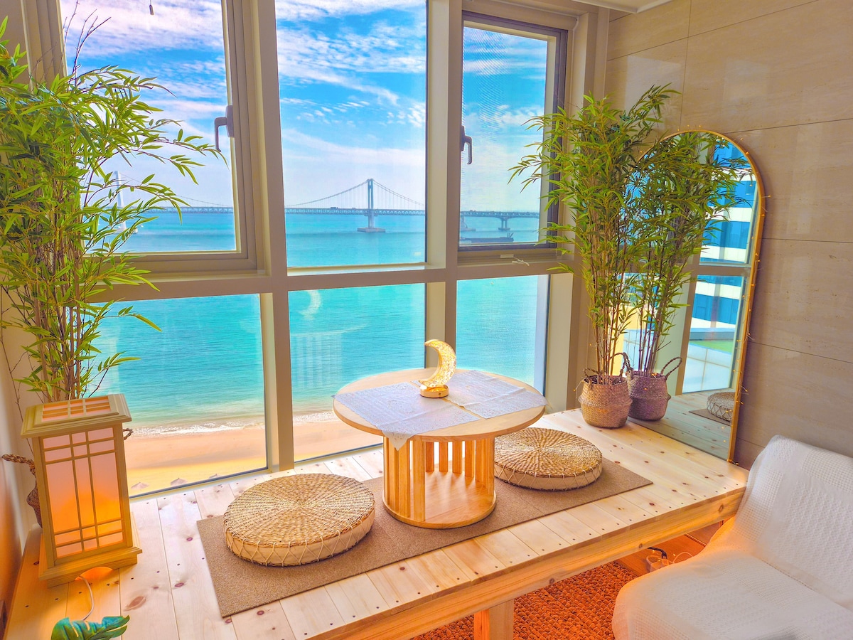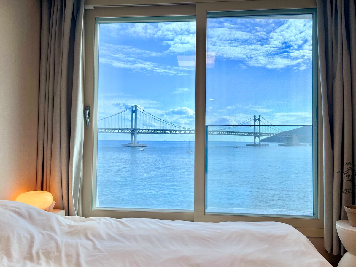 Rummet har❤️ nyligen utökats Den har 2 sovrum och 1 vardagsrum. Du kan sova bekvämt med 1 dubbelsäng och 2 dubbelsängar:) Tack för att du besökte Anri villa. Fantastisk utsikt över bron med 🎇supernära Gwangan Bridge (full havsutsikt) Du kan se det från både💕 vardagsrummet och sovrummet. Healing Full Ocean View och Gwangan Bridge View "Dela ditt liv"💖 Nybyggt 20-pyeong-boende i premiumklass👍 Vi prioriterar tvätt, sanering, rengöring och renlighet av sängkläder varje dag.😉🎇 Gratis parkering på 1: a till 3: e våningen🍃 i boendebyggnaden (självgående) Njut av 🍃Netflix YouTube och mycket mer med en smart-TV. Milak The Market 🍃precis intill, 10 minuter med bil från Haeundae Det finns bekvämligheter som ett kafé och vinbutik på 🍃bottenvåningen. 🍃🍃 Antistress-te (ekologiskt), handdroppkaffe och rökelse är tillgängliga. Om ditt sinne är komplicerat hoppas jag att det blir lite lättat med varmt te och dofter.