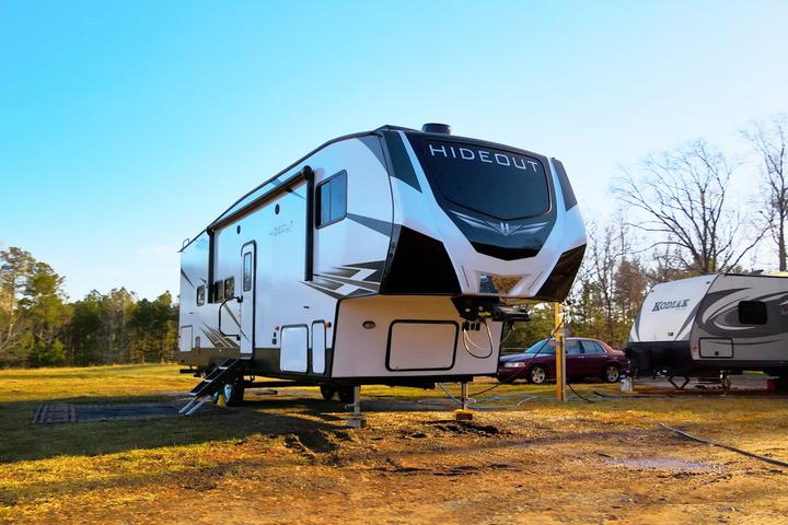 Fantastiskt hem utanför hemmet. Njut av freden utomhus,liksom att sova bekvämt. Det finns 2 Smart TV-apparater inomhus att njuta av. RV har WiFi. Laga mat inomhus eller grilla utomhus med din bärbara kololgrill. Kol- och tändvätska ingår. Bluetooth-radio. RV är utrustad med tallrikar, kaffebryggare,skålar,koppar och redskap. Stolar finns i det yttre förvaringsutrymmet för att du ska kunna njuta av att sitta utanför under den nya markisen på 20 fot. Inuti och utanför dusch. 2 gallon gas kan ombord på husbilen.