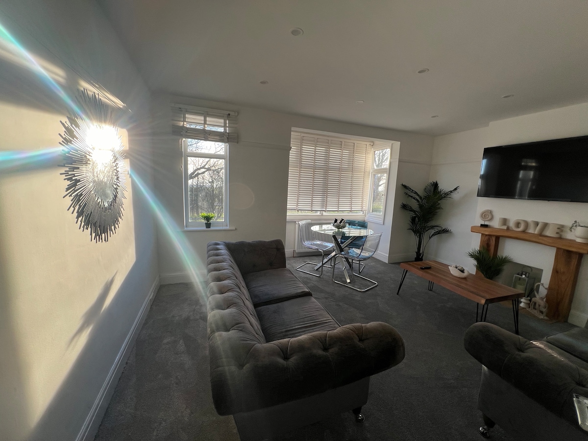 En nyrenoverad enrumslägenhet med en ren, modern design. Den är genomtänkt möblerad och har bekväma sängkläder, elegant inredning och en välkomnande atmosfär. Njut av en Smart-TV, fullt utrustat kök, bad, dusch och privat parkering precis vid ytterdörren. Höjdpunkten är en liten innergård med konstgräs och ett matbord för fyra personer utomhus. Det ligger nära Hadleigh Castle och Country Park och är perfekt för affärsresor, par eller avkopplande resor.