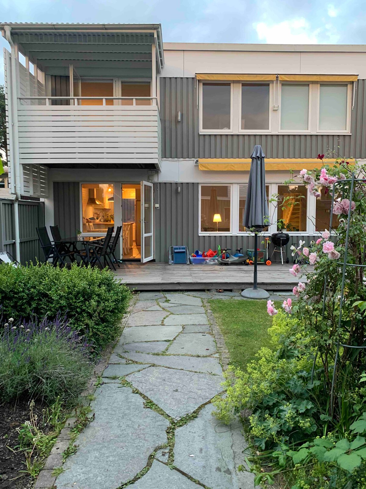 Would you like to discover Stockholm and the arquipelago and stay in a lovely calm area? Warmly welcome to our 30 sqm tiny house with a fully equipped kitchen and modern bathroom. Sleep on a comfortable sofa bed or the cosy sleeping loft. Have dinner at the dining table and step outside and enjoy coffee on a sunny wooden terrace with a view into our beautiful garden. Bed linen & towels are included and even coffee/tea. The local train will take you to Stockholm in just 18 min. No need for a car.