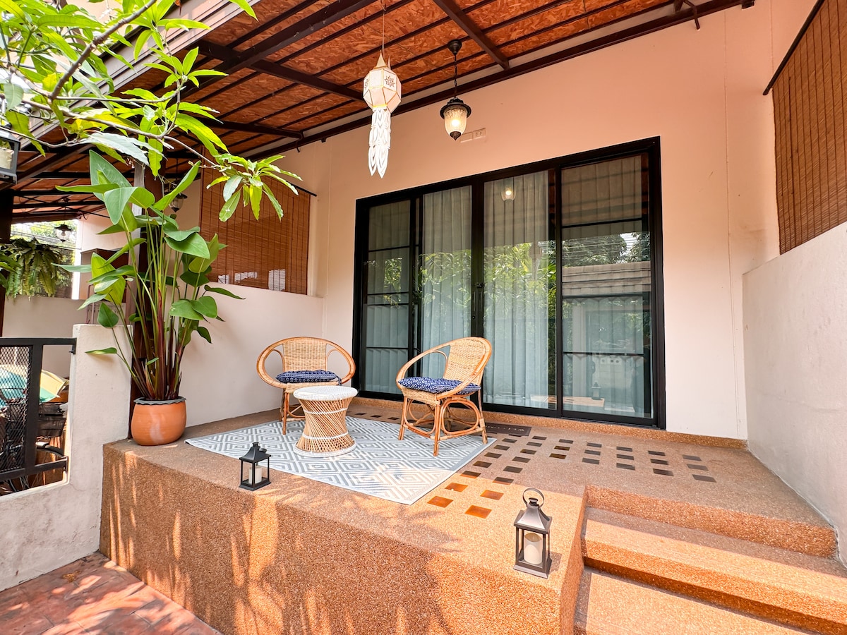 Vårt charmiga hem är halvträ med 3 sovrum med luftkonditionering och 3 badrum. Det är utrustat med ett kök, en bar, fiberoptiskt wifi och ett stort öppet utrymme på övervåningen. Det är perfekt för en familj med barn eller en grupp vänner. Vi ligger 10 minuters gångavstånd från Chiangmai Gate och lördagens gågata. Vi erbjuder gratis hemlagad frukost varje morgon och en gratis upphämtning från flygplatsen.