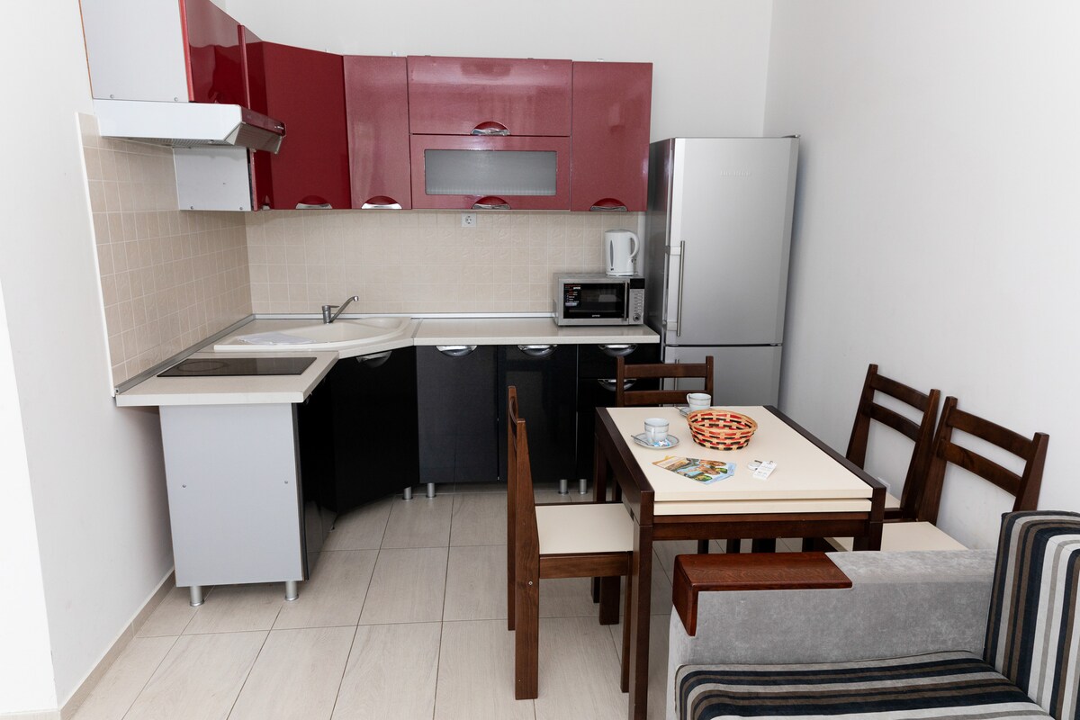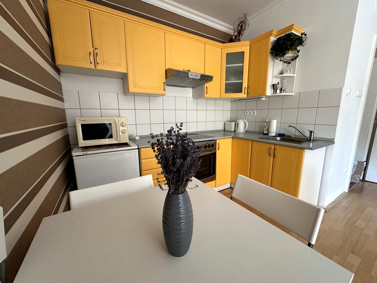 Konstdräktslägenheter. Rymlig, ljus lägenhet utrustad med allt du behöver. I rummet hittar du ett utrustat kök, en dubbelsäng och en en fällbar bäddsoffa, ett bord med stolar för att äta, ett badrum med en toalett, samt en garderob och en TV. Lägenheten är gratis WIFI. Art Suit ligger två hundra meter från Hungaro Spa termisk och fyra hundra meter från Aqua Palace underhållningskomplex.