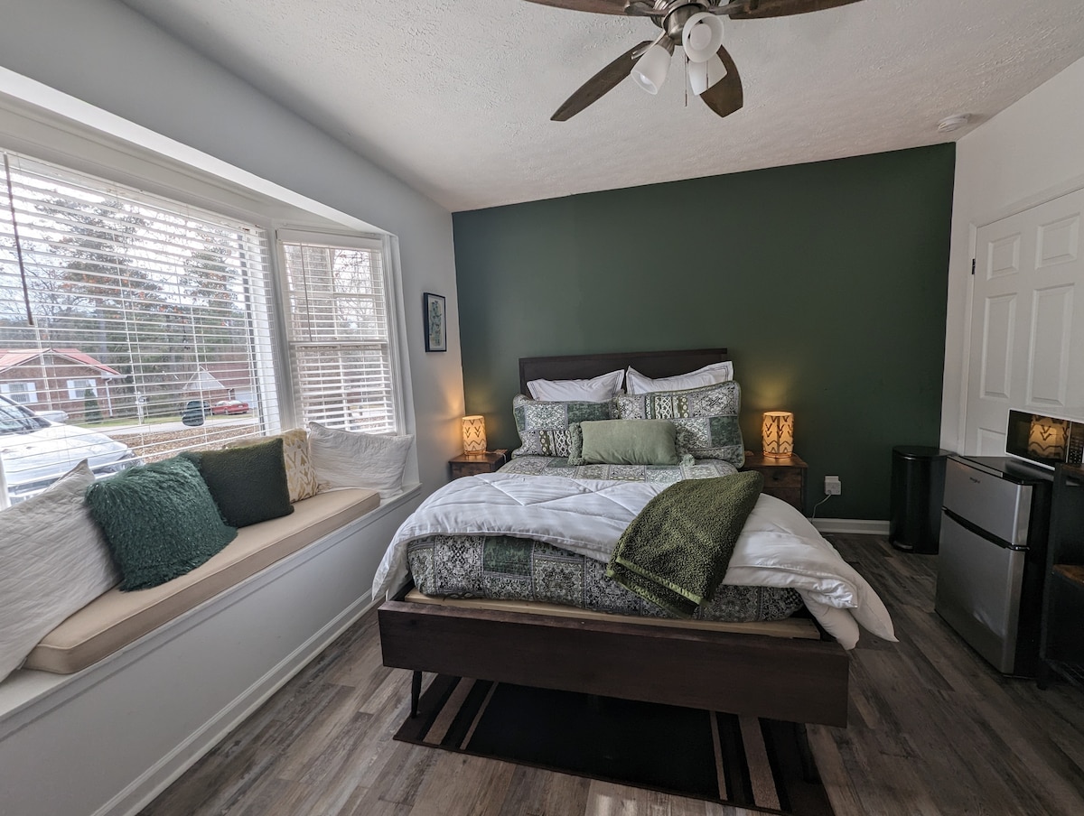Du kommer inte vilja lämna detta charmiga, unika ställe. The Great Green Room erbjuder en helt privat entré, vardagsrum och badrum. Det är anslutet till vårt personliga hem men har noll delat utrymme. Det är utrustat med minikylskåp, mikrovågsugn, kuerig, brödrost och köksartiklar. Vi ligger nära bra mat och shopping. Endast fem minuter från Lake Lanier och centralt beläget mellan Gainesville och Flowery Branch, GA. Vi ligger nära 985 och 20 minuter från Mall of Georgia!