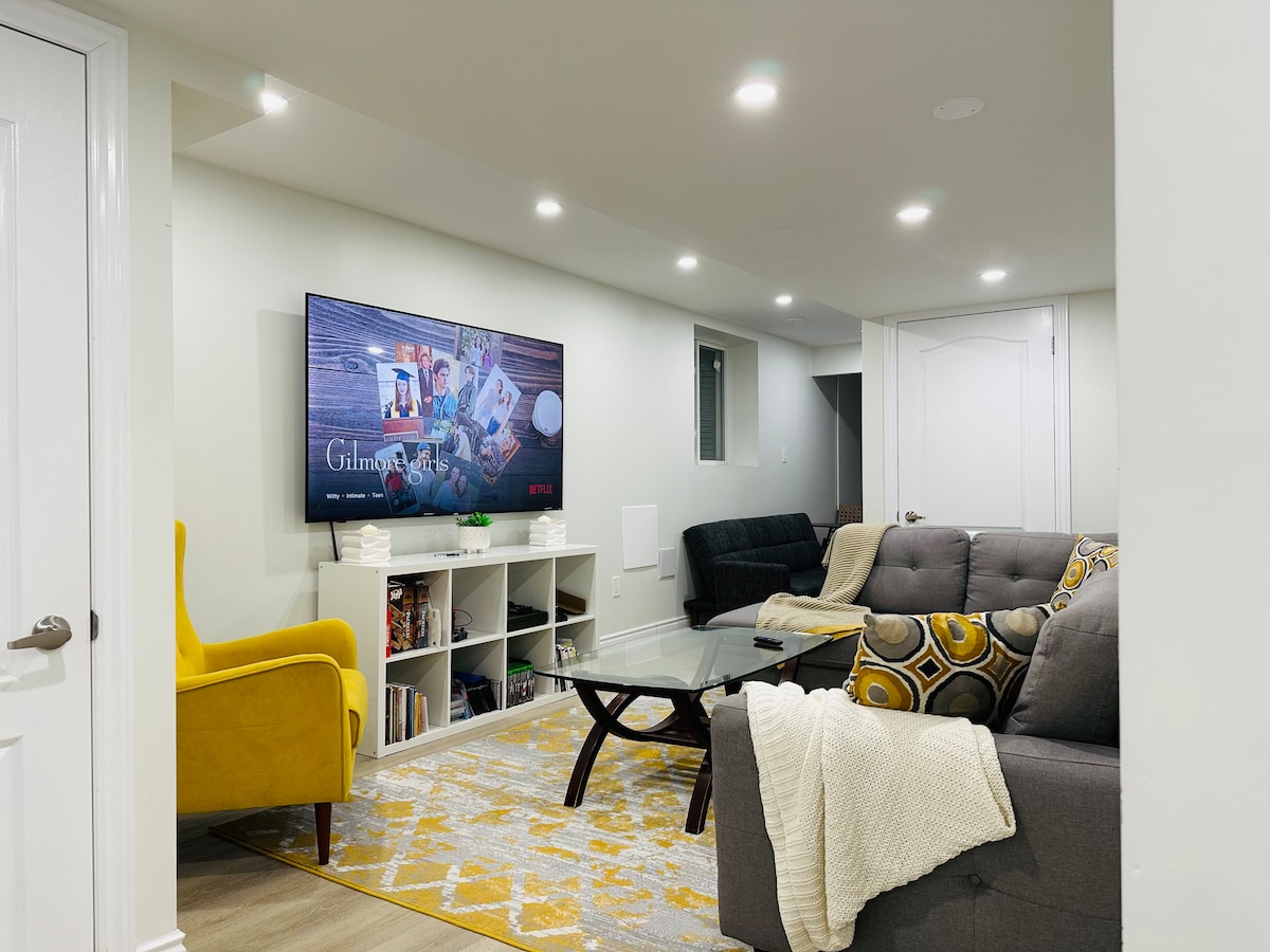 Välkommen till vår mysiga källarlägenhet! Detta moderna Airbnb ligger i ett lugnt bostadsområde 40 minuters bilresa från Toronto centrum och en timme från Niagara Falls. Det väl upplysta utrymmet har en bekväm queen-size säng, gott om förvaring i den rymliga garderoben och en vackert designad interiör med naturligt ljus som översvämmar genom stora fönster. Obs: Vi har 2 enkla hopfällbara madrasser tillgängliga att placera på golvet i vardagsrummet. Extra sängkläder och kuddar tillhandahålls.