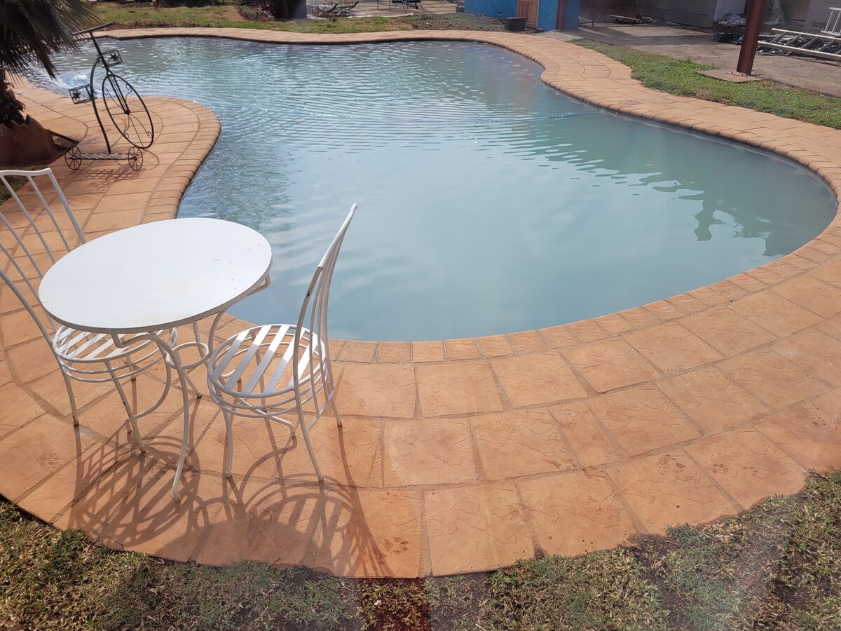 Vackert, mysigt hus med tre sovrum belÀget i ett sÀkert komplex, i Acturus road, Greendale. Tillförlitlig vatten- och strömförsörjning med reserv av solenergi och ett borrhÄl. Vackra komplexa faciliteter - Klubbhus med pool och braai/grillmöjligheter (delas med andra invÄnare i komplexet). Snabbt fiberoptiskt wifi. DSTV (kabel-TV) med dubbla vyer: i loungen och i sovrummet.