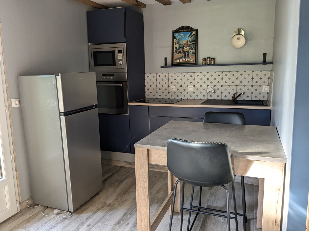 Charmig gammal brödugn i korsvirkestil, belägen vid en bäck och består av: - Vardagsrum med vedspis, - Kök, - På övervåningen: - Duschrum / toalett tillgänglig via en mjölkarlsstege (se bilder), - sovrum med en säng 160x200 med utsikt över bäcken, tillgänglig via en mjölstegar (se bilder), Sovrum och badrum är inte anslutna. Trädgårdsmöbler, grill, privat parkering, ved ingår Observera att ett annat boende, Maison de pierres, ligger 100 m bort