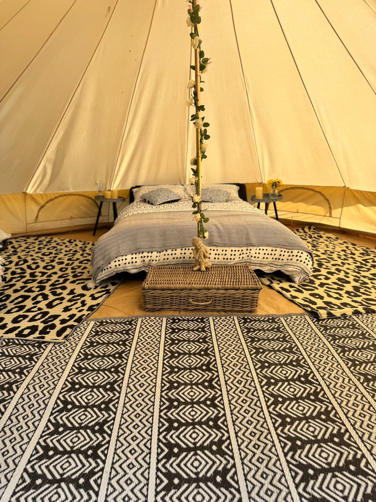 Fly till naturen i vårt charmiga klocktält, perfekt för par som vill koppla av i en lugn landsbygdsmiljö. Beläget i utkanten av böljande jordbruksmark med utsikt över frodig skog och betande får är detta den perfekta platsen för en romantisk semester eller en digital detox. Inuti ditt tält är bekvämt möblerat med en plysch dubbelsäng och mjuka sängkläder. Gå ut till din privata eldstad perfekt för stjärnskådning med ett glas vin eller rosta marshmallows under stjärnorna.