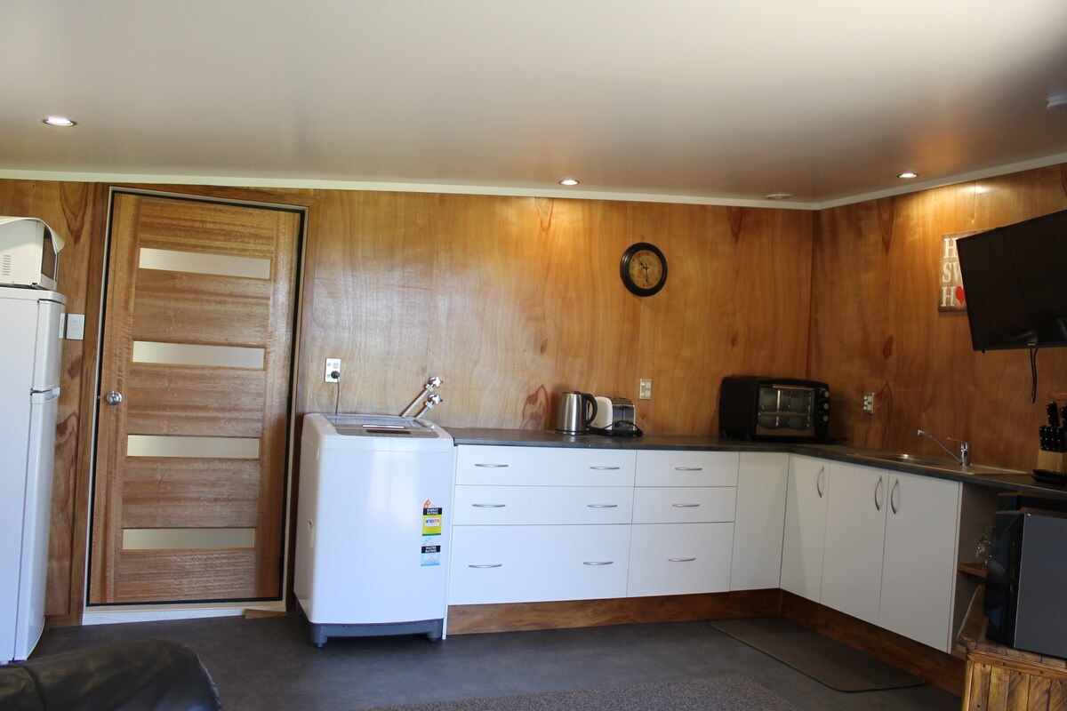 Denna ljusa, luftiga och fridfulla stuga är en ombyggd del av en holländsk lada i en härlig liten trädgård omgiven av pilträd. Det finns bra promenader från dörren; runt flodmynningen, som ligger precis över vägen, och bortom via Omokoroa Cycleway. Längre upp på uppfarten hittar du paddocken med våra två alpackor och en bubblande bäck som rinner genom den. I stugan finns ett kök med liten ugn, enkel induktionshäll och mikrovågsugn. Snabbt wifi ingår.
