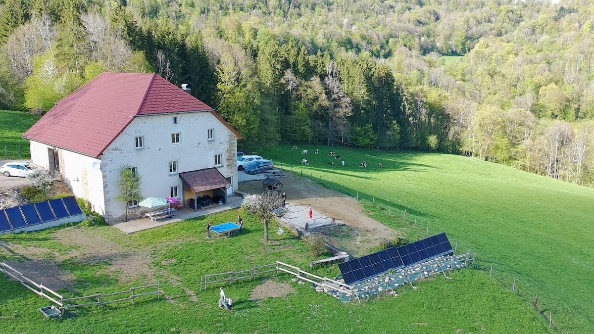 Koppla av i detta lugna, eleganta privata boende i Haut Doubs nationalpark, på 1:a våningen i en Franc-Comtois bondgård från 1800-talet, renoverad 2023, fullt utrustad. Separat ingång. Vilsam, naturlig miljö nära bekvämligheter (2 km). Du hittar ett sovrum, ett badrum med dusch och toalett, en matplats med eget fullt utrustat kök och en privat terrass med utsikt över de närliggande kullarna. Sängkläder tillhandahålls. Fri parkering.