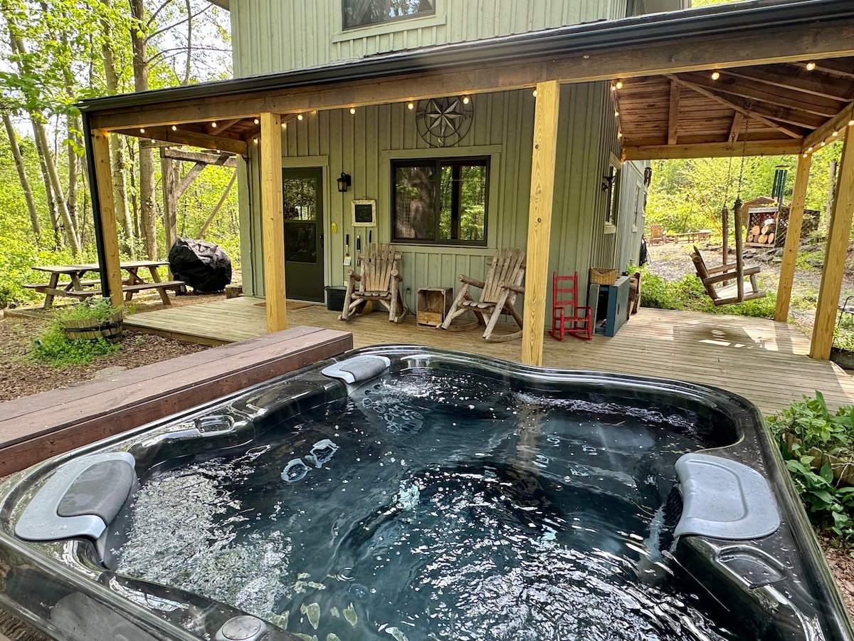 Denna unika och avskilda stuga ligger på 75 tunnland i Blue Ridge Mountains. Njut av den mysiga vedspisen, bubbelpoolen, kolgrillen och snabbt, pålitligt fiberoptiskt internet om du behöver få lite arbete gjort medan du är borta. Den har en tvättmaskin och torktumlare, ett fullt utrustat kök och är djurvänlig (ingen avgift för husdjur!), så att du kan njuta av den med hela familjen. Det finns en 4K 55" smart-TV med appar, en Tesla LVL 2-laddare, ett skåp fullt av brädspel, böcker och massor av föremål för att underhålla både barn och vuxna!