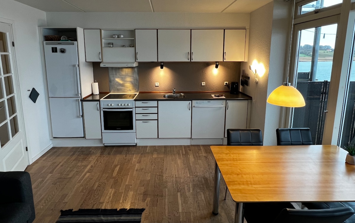 Enjoy stunning views of Kolding Fjord from this bright 110 m² first-floor apartment in a charming white patrician villa. Features 2 double bedrooms, a large bathroom, cozy living room, and a fully equipped kitchen-dining area with access to a private terrace with sun loungers. We live quietly on the ground floor and respect your privacy.
