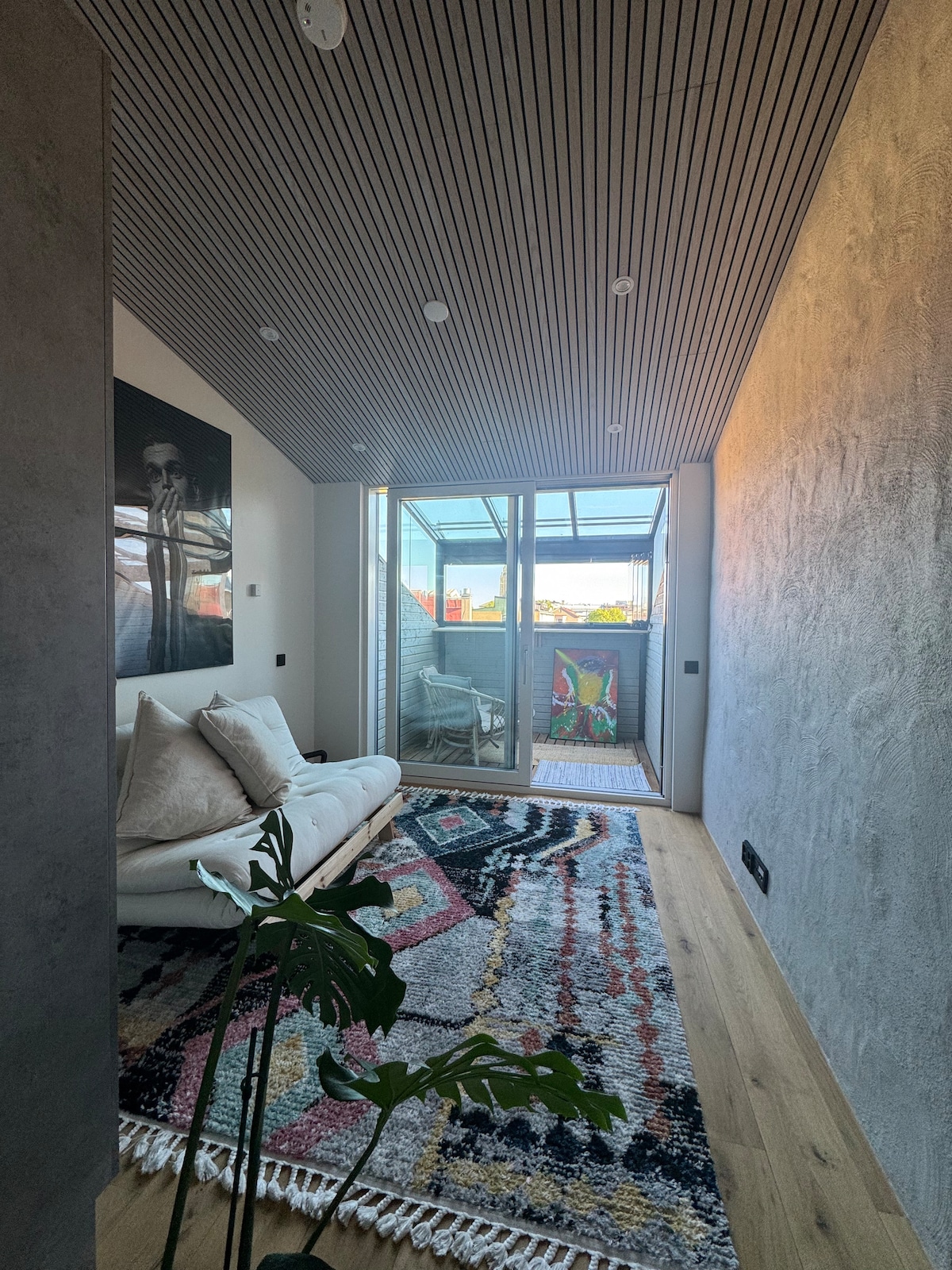 Rumshöjden i denna unika loftbostad stiger över fyra fot. Du har tillgång till en ny stor studio som naturligt delas upp i ett vardagsrum, en matsal, ett kök och ett sovrum i full höjd på övervåningen. Köket är fullt utrustat, en diskmaskin kan hittas, samt en ugn/mikrovågsugn och en kaffekapselmaskin. Lägenheten har ett rymligt badrum, och en större grupp kan också sova på en bäddsoffa. Spårvagn 9 tar dig nästan till din dörr!