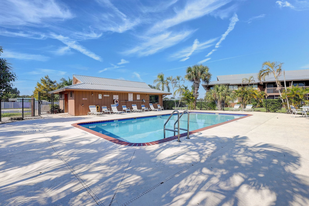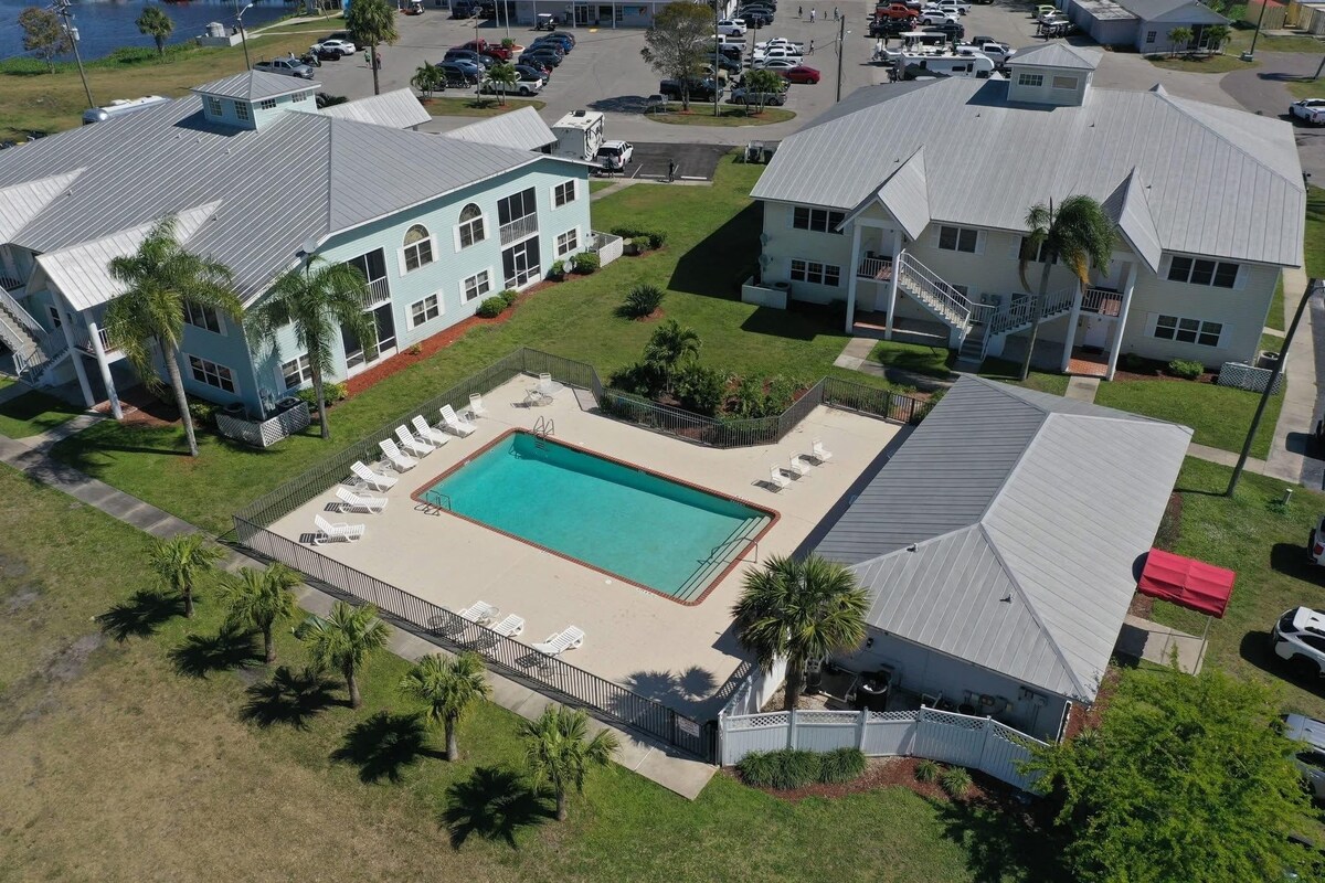 Perfekt Okeechobee fiske semester! Kort bilresa till båtramper, promenad bredvid marina/Tiki Bar. Bass & Sun 2:a våningen walk-up lägenhet med 2 sängar (K&Q), 2 badrum. Fullt utrustat kök. Soffan har dubbla vilstolar. Vardagsrum och båda sovrummen har smarta TV-apparater. Det andra sovrummet har ett inbyggt skrivbord i den stora garderoben. Skärmad balkong med utsikt över poolen. Höghastighets WI-FI, USB-laddningsportar, tillgång till uppvärmd pool. 1 dedikerad parkeringsplats, gästparkeringsplatser för extra fordon/släpvagnar. Inga husdjur/Rökning förbjuden