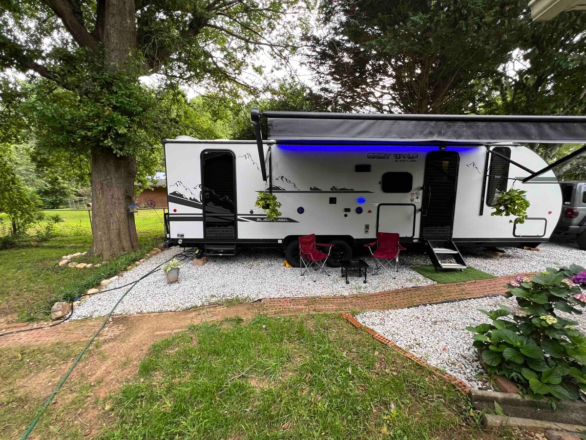 Härlig, bekväm, lyxig Rv inbäddad på en vacker, 5 tunnland hästgård precis utanför Atlanta och 20 minuter från flygplatsen! Kom och njut av det vackra landskapet och se hästarna leka! Observera att vistelsen på gården INTE inkluderar ridning på hästar eller RV hook-ups. Ridlektioner anordnas uteslutande genom Foundation Farms Atlanta. Husbilen är laddad med klockor och visselpipor, en 5 minuters promenad genom vid ankomsten kommer också att inkluderas för att hjälpa till att göra din tid på besök smidig och bekväm!