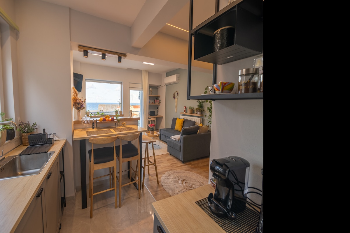 Αυτό το κομψό διαμέρισμα είναι ιδανικό για μια αξέχαστη διαμονή στο Ηράκλειο.Βρίσκεται σε προνομιακή τοποθεσία.Η φανταστική θέα,ο μοναδικός χώρος και η Κρητική φιλοξενία,θα σας κάνουν να νιώθετε σαν το σπίτι σας. Ευρύχωρο (45 τετραγωνικά), σύγχρονο και σας παρέχει όλα όσα θα μπορούσε να χρειαστεί ένας ταξιδιώτης. Δωρεάν και γρήγορο Wi-Fi , πλήρως εξοπλισμένη κουζίνα, πλυντήριο ρούχων στο διαμέρισμα και ιδιωτικό μπαλκόνι με θέα τη θάλασσα για να απολαύστε το πρωινό και τον καφέ σας.