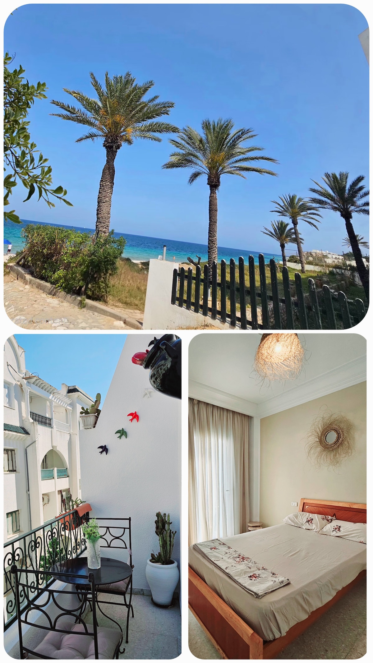 Fantastisk lägenhet med panoramautsikt över havet i Chott-Mariem, i ett lugnt och säkert boende med pool och direkt tillgång till stranden. 🌊 Ljust, modernt och fullt utrustat – perfekt för par, familjer (barnvänligt), vänner och distansarbetare. Snabbt WiFi, säker parkering, butiker i närheten. För en ännu roligare vistelse: volleyboll, strandtennis, masker och snorklar finns tillgängliga på begäran 🎾🌊 En avkopplande miljö vid havet för en verkligt oförglömlig vistelse. ☀️