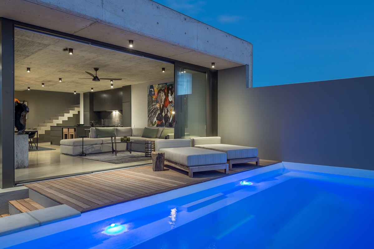Protea Loft Cottage ligger under grenarna av ett gammalt träd. Protea är den översta enheten av två stugor i en stor trädgård. Ett luftigt öppet utrymme, elegant inrett med din komfort i åtanke. Öppna skjutdörrarna, luta dig tillbaka på den bekväma soffan och se ut över trädgården och poolen. Mitt ställe ligger nära bergskonturstigar, klippstigar och stränder. Du kommer att älska mitt ställe eftersom det är fridfullt, bekvämt, har en vacker havsutsikt och är säkert.