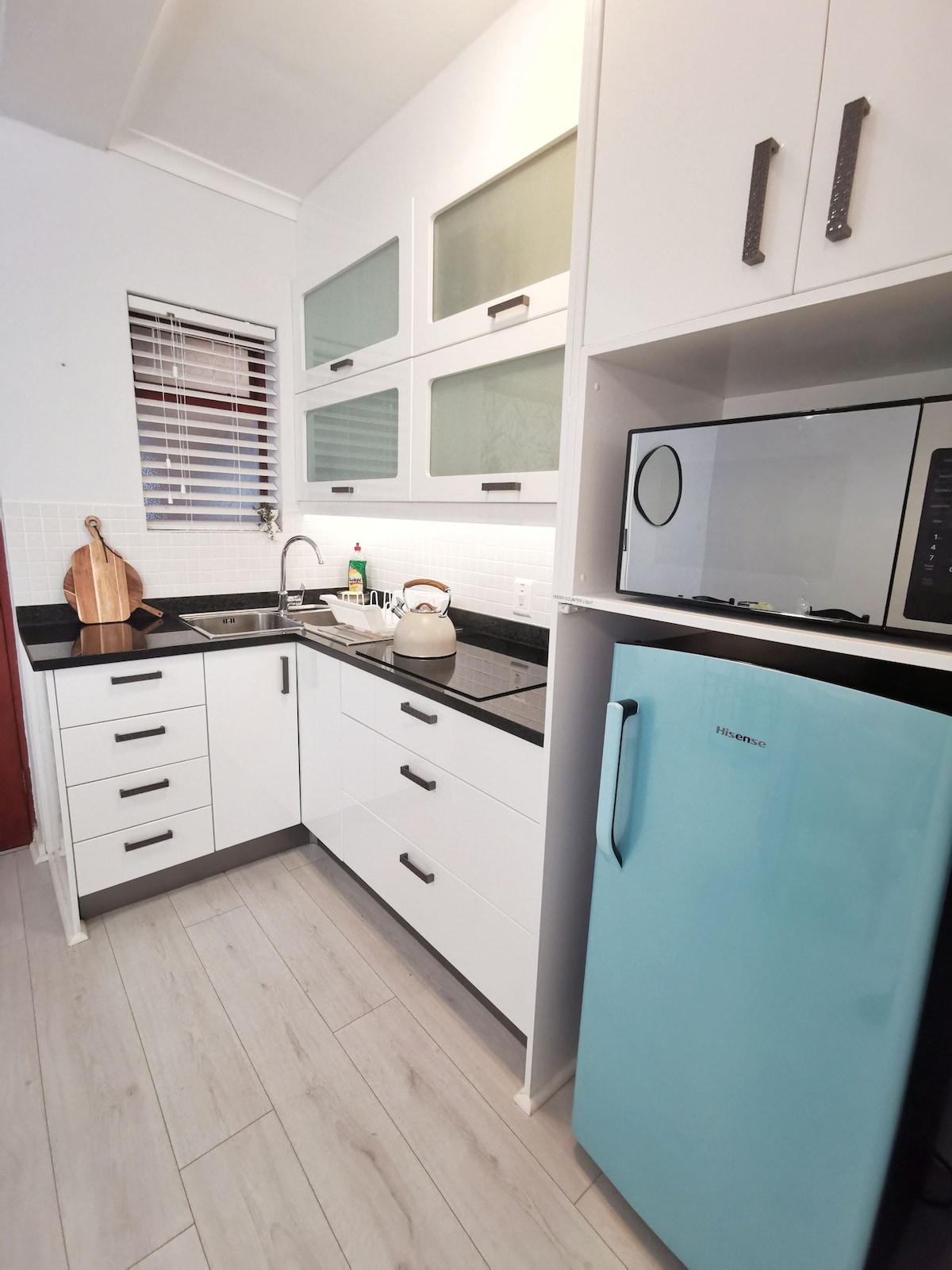 En charmig öppen stuga, inbäddad nära klippvägen och valskådning utkikspunkter av Hermanus. Den fristående stugan ligger på baksidan av en permanent privat bostad med egen ingång. Det finns ett mysigt vardagsrum och bekväma sittplatser. Det är den perfekta platsen för att koppla av efter en dags utforskning. I anslutning till vardagsrummet hittar du ett välutrustat kök. Du behöver inte oroa dig för strömavbrott.