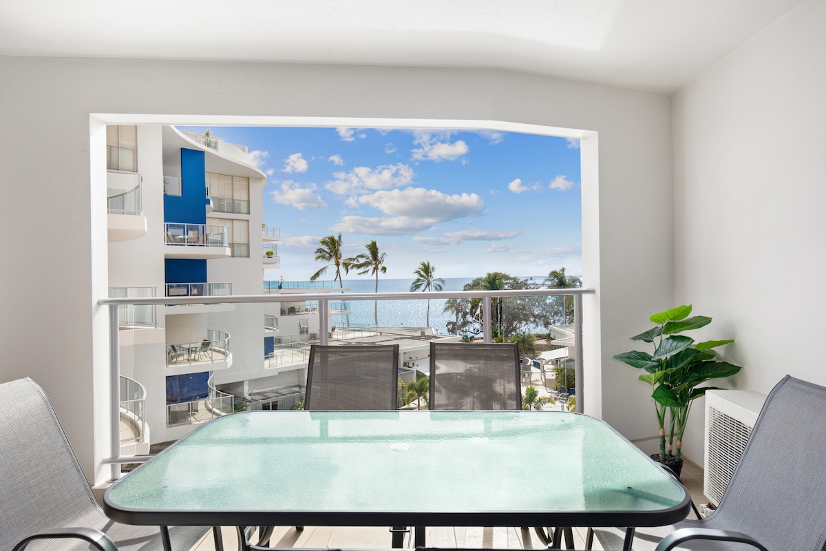 Lyxig bottenvåning vid stranden med fantastisk havsutsikt från balkongen, vardagsrummet och det stora sovrummet. Funktioner inkluderar 2 sovrum, 2 badrum, fullt linne tillhandahålls inklusive handdukar, fullt utrustat kök med diskmaskin, luftkonditionering och en rymlig 25 kvm balkong. Njut av bekvämligheter som pool, spa, gym och säker parkering. Promenera till stranden, Urangan Pier, kaféer, restauranger och butiker. Den perfekta platsen för din nästa familjesemester.